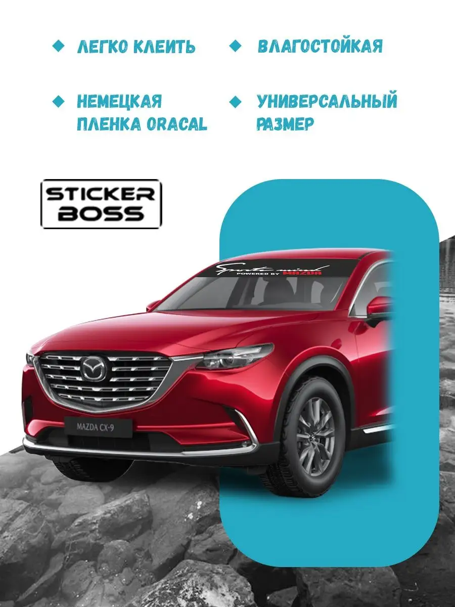 Стикеры Stickerboss помогают декорировать и повышать комфорт вождения. Солнцезащитная полоса для лобового стекла Mazda размером 150х20 см обеспечивает защиту от бликов и снижение дискомфорта от яркого света за рулём.