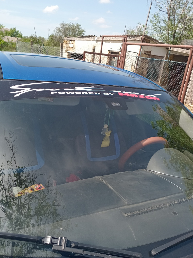 Назначение наклейки — лобовое стекло автомобиля. В названии указан автомобиль Mazda; наклейка подходит для стандартных лобовых стекол и легко подгоняется под форму стекла.