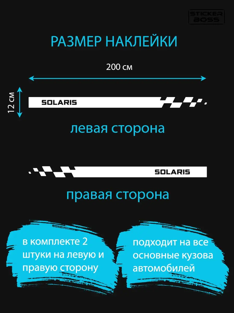 Стильные наклейки Stickerboss предназначены для декоративного тюнинга автомобиля и подчёркивают динамичный характер машины. Дизайн выполнен в виде полос и шашек, который гармонично обрамляет нижнюю часть бортов и кузова.