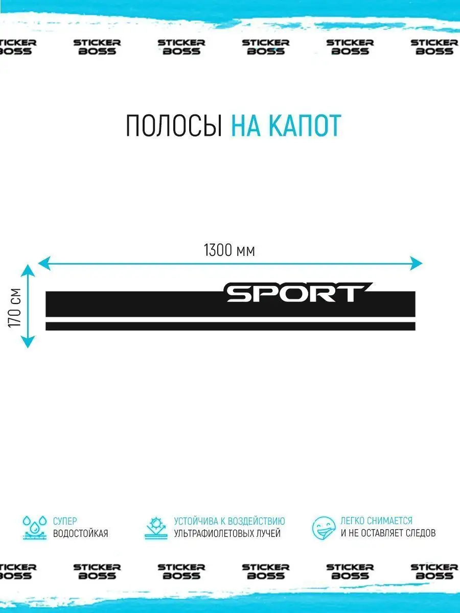 Наклейка на капот авто sport — декоративная наклейка для внешнего оформления автомобиля. Дизайн состоит из двух аккуратных полос разной ширины и выполнен в черном цвете, что подчеркивает динамику кузова и придает автомобилю индивидуальность.