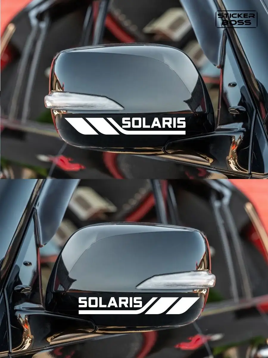 Наклейки на зеркала SOLARIS — декоративные полосы для тюнинга вашего автомобиля. Набор состоит из 2 шт белых наклеек из прочного винила, которые легко наносятся и снимаются без следов, не требуют дорогих модификаций.
