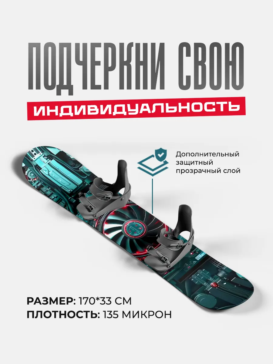 Виниловая наклейка на сноуборд размером 170×33 см обеспечивает яркий образ и защиту поверхности. Ассортимент включает пейзажи, мотивы природы, знаменитые персонажи и аниме, а также абстрактные узоры. Наклейки стойкие к внешним воздействиям и рассчитаны на длительный срок службы.