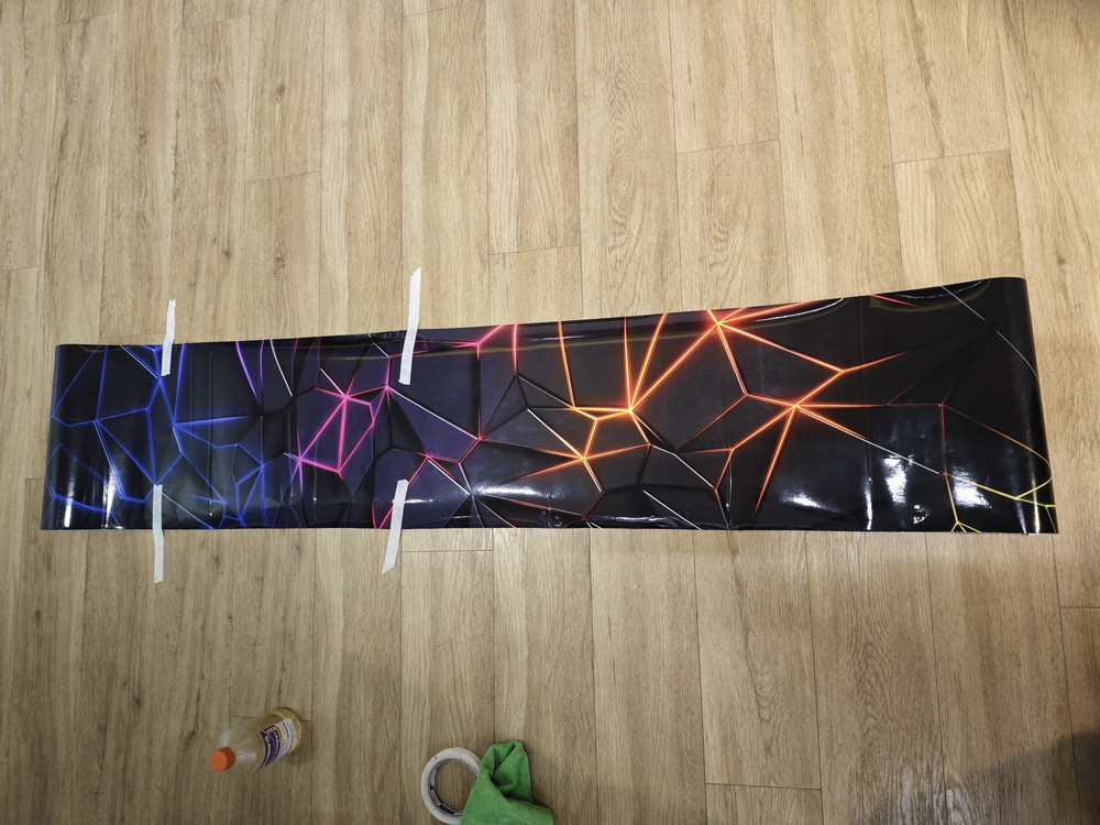 Очистите поверхность, удалите пыль и грязь, высушите участок. Удалите защитную пленку и аккуратно наклейте принт от одного края до другого, разглаживая пузырьки воздуха шпателем или пластиковым картоном.