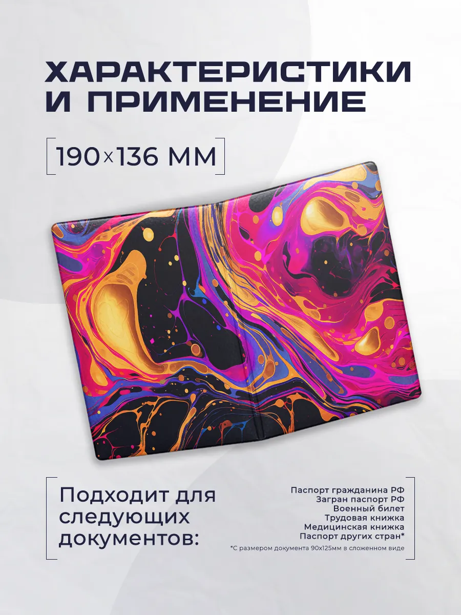 Стильная обложка на паспорт из искусственной кожи с ярким принтом абстракции краски обеспечивает надежную защиту документов и стильный акцент. Модель рассчитана на паспорт и дополнительный документ благодаря двум карманам и отсутствию застежки, что упрощает использование.