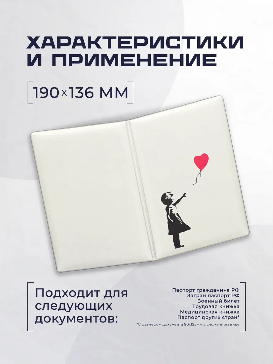 Стильная обложка на паспорт из эко-кожи обеспечивает защиту документов и оригинальный внешний вид. Дизайн с мотивом бэнкси девочка с воздушным шаром придает аксессуару характерный урбан-штрих, который хорошо сочетается с повседневной одеждой и документами. Обложка выполнена с учетом долговечности и удобства повседневного использования, а материал экологически чистый и приятный на ощупь. Подходит для ношения в сумке или кармане, легко надевать на паспорт и другие документы без лишних деталей.