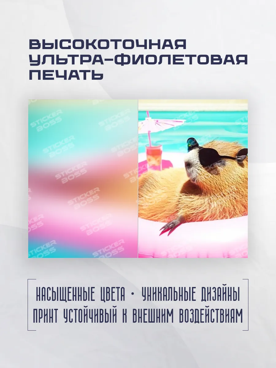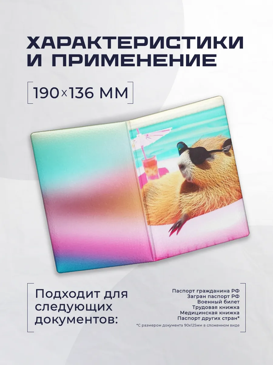 Стильная обложка для паспорта Stickerboss выполнена из искусственной кожи и экокожи с ярким принтом капибары в очках. Это практичный аксессуар, который сочетает защиту документов и индивидуальный стиль.