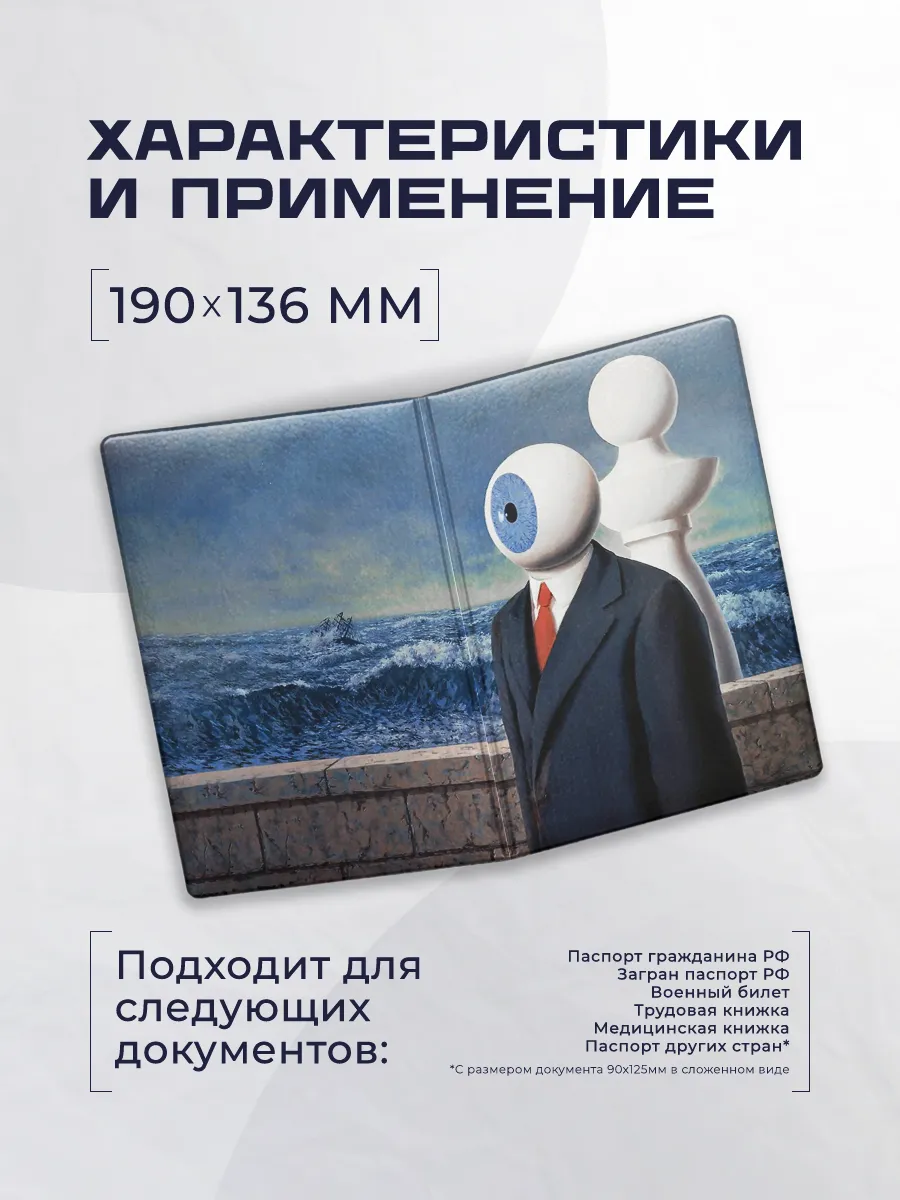 Эта обложка-чехол для паспорта из эко-кожи сочетает защиту документов с ярким дизайнерским акцентом. Принт в духе художника Магритта делает аксессуар запоминающимся и стильным.