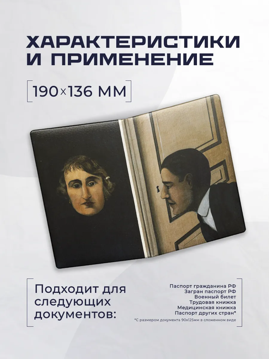 Эта обложка для паспорта сочетает защиту документов и индивидуальный стиль. Выполнена из эко-кожи и украшена принтом Рене Магритт 185, что делает ее заметным аксессуаром для повседневной жизни. Элегантный дизайн сочетается с функциональностью и удобством использования в поездках и повседневной суете.