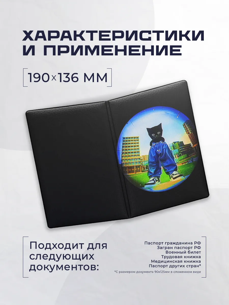 Используйте как защиту паспорта и документов в повседневной эксплуатации. Дизайн с котом добавляет индивидуальности и делает аксессуар заметным.