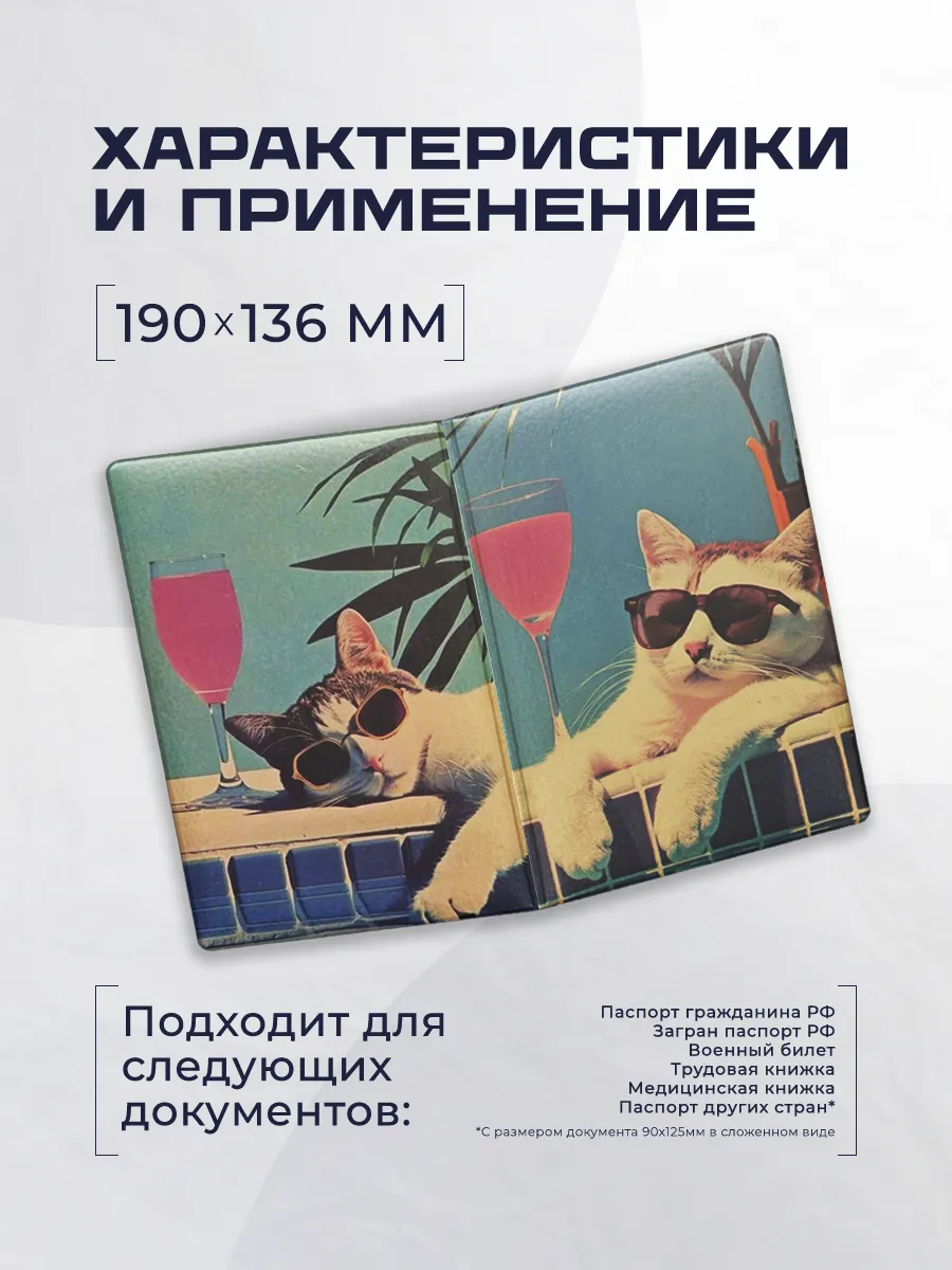 Стиль и функциональность: компактный размер около 14×19 см подходит большинству паспортов, а без застежки обеспечивает легкий доступ к документам. Обложка совместима с паспортом, СНИЛС и проездным билетом, сделав путешествия и повседневные походы проще и удобнее. Дизайн в мем‑мотиве котика в очках привлекает внимание и подходит как повседневный аксессуар, так и оригинальный подарок близким.