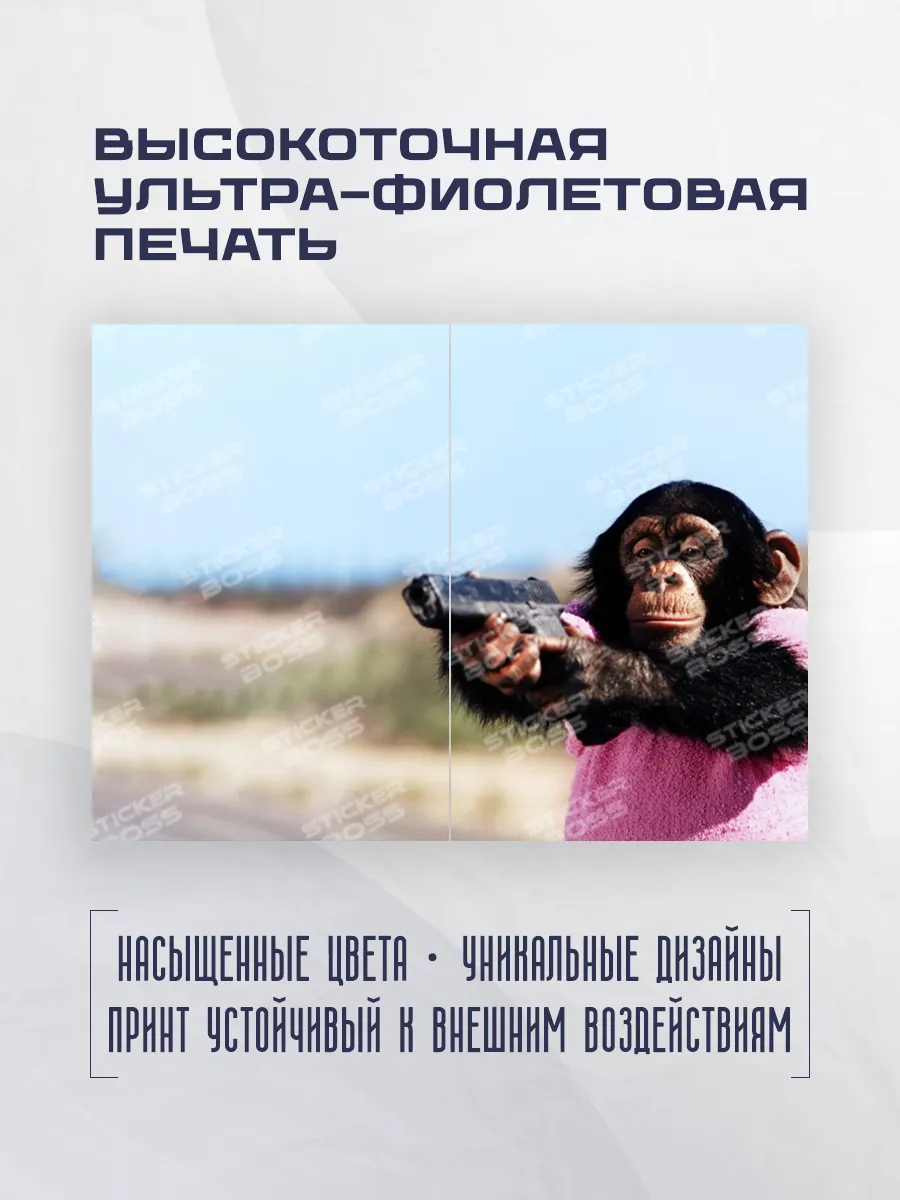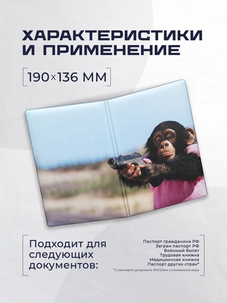 Стильная обложка-чехол на паспорт из эко-кожи с ярким мемом обезьяна с пистолетом выполнена в узнаваемом дизайне Stickerboss. Она сочетает эффектный внешний вид с практичностью: ваши документы будут под рукой и в безопасности, а внешний вид аксессуара подчеркнет индивидуальность.