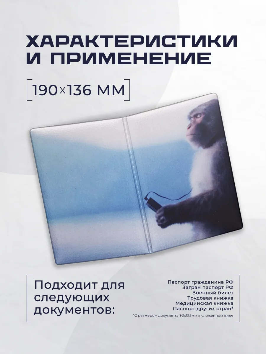 Использованы современные материалы — искусственная кожа, эко-кожа и ПВХ — чтобы обеспечить прочность и приятные на ощупь тактильные ощущения. Застежка отсутствует, что позволяет быстро доставать документы. Дизайн с мем обезьяна в наушниках обеспечивает запоминающийся стиль.
