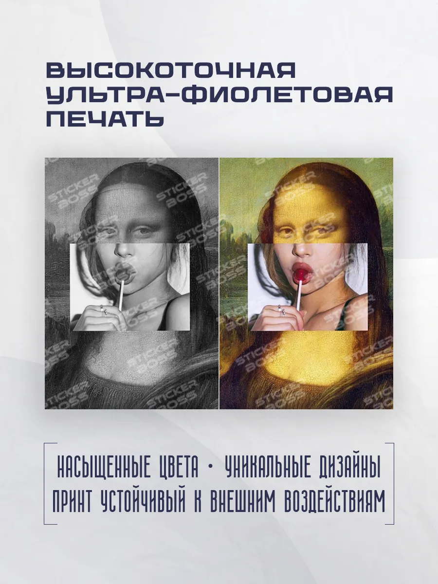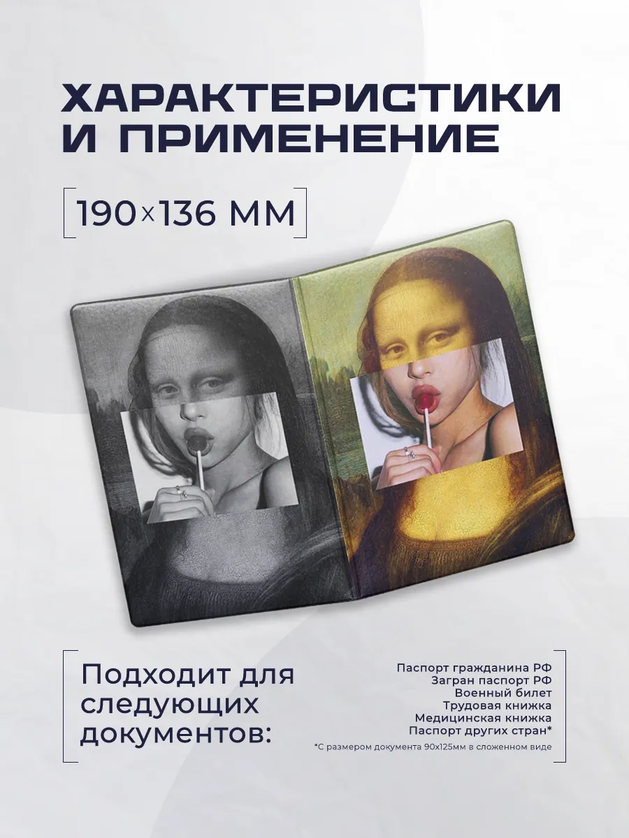Стильная обложка для паспорта из эко-кожи сочетает защиту документа и яркий стиль. Рисунок мона лиза с чупа чупсом выполнен в духе Stickerboss, поэтому образ дизайна узнаваем и запоминается. Обложка легкая, прочная и не требует особого ухода, а поверхность приятна на ощупь. Благодаря двум карманам можно разместить дополнительные документы, а отсутствие застежки упрощает использование. Изготовлена в России и подходит для повседневной носки и подарка близким.