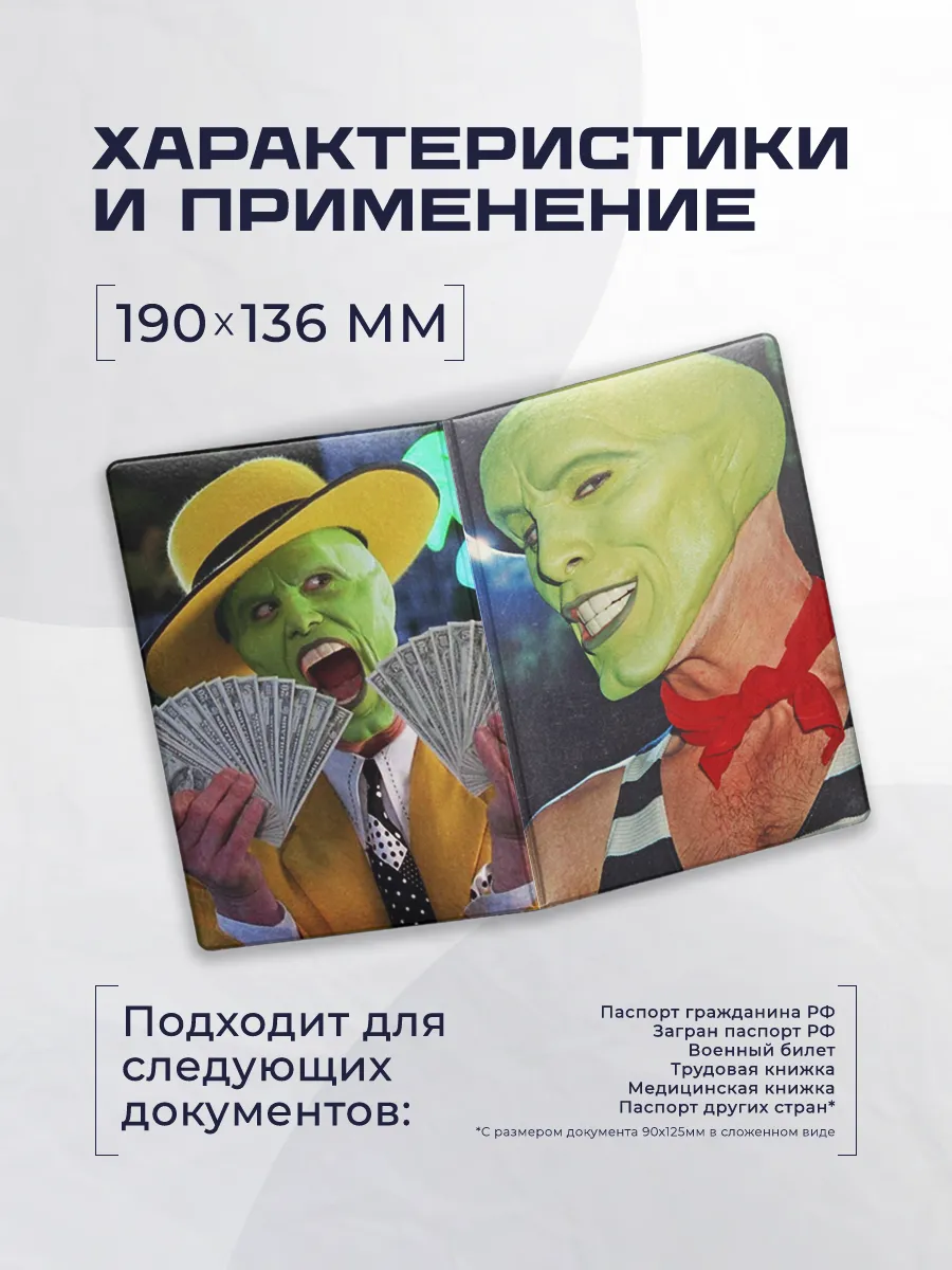 Стильная обложка для паспорта обеспечивает защиту и индивидуальность. Выполнена из искусственной кожи, эко-кожи и ПВХ, дизайн включает принт с элементами 'зелёная маска Джим Керри'. Удобна в повседневном использовании.