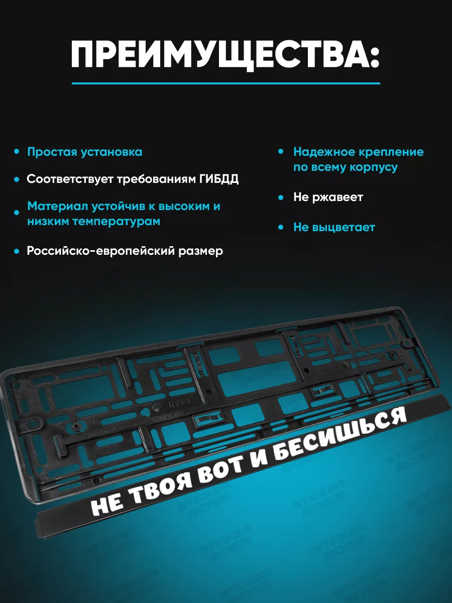 Рамка для ГОС номера автомобиля 52х13х1 см универсальная, выполнена из качественного и надежного ABS пластика. Она подойдет практически для любой марки автомобиля. На лицевой стороне выполнена качественная печать методом УФ печати, которая устойчива к любым погодным условиям, не выгорает со временем и не выцветает. Принты и надписи выполнены в лучших традициях Бренда Stickerboss, что способствует привлечению все большего количества восторженных взглядов к вашему авто. Наши рамки для машины будут выполнять не только свою основную функцию по креплению номерного знака, но и добавит стиля вашей машине. Ее легко установить: крепление надежное, плотно прилегает к бамперу и прослужит Вам длительное время. Такой автотовар - отличная идея для подарка другу! Автомобильному аксессуару не страшны дождь, снег и перепады температур. Конструкция изделия соответствует требованиям ГИБДД, имеет Российско-европейский размер. Вы можете выбрать любую из рамок с надписью на свой вкус, перейдя в каталог магазина Stickerboss! Также от нашего бренда можно приобрести разные товары для авто.