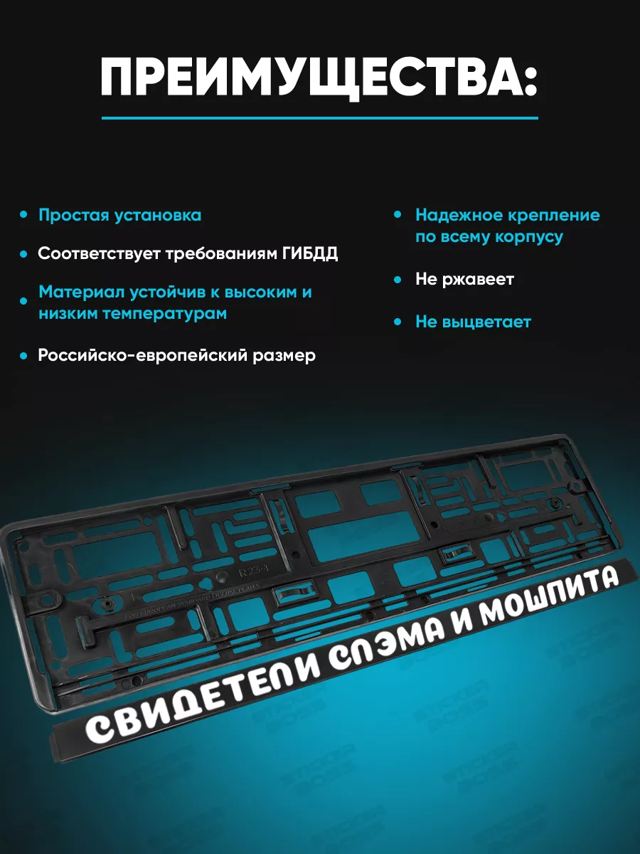 Рамка для ГОС номера автомобиля 52х13х1 см универсальная, выполнена из качественного и надежного ABS пластика. Она подойдет практически для любой марки автомобиля. На лицевой стороне выполнена качественная печать методом УФ печати, которая устойчива к любым погодным условиям, не выгорает со временем и не выцветает. Принты и надписи выполнены в лучших традициях Бренда Stickerboss, что способствует привлечению все большего количества восторженных взглядов к вашему авто. Наши рамки для машины будут выполнять не только свою основную функцию по креплению номерного знака, но и добавит стиля вашей машине. Ее легко установить: крепление надежное, плотно прилегает к бамперу и прослужит Вам длительное время. Такой автотовар - отличная идея для подарка другу! Автомобильному аксессуару не страшны дождь, снег и перепады температур. Конструкция изделия соответствует требованиям ГИБДД, имеет Российско-европейский размер. Вы можете выбрать любую из рамок с надписью на свой вкус, перейдя в каталог магазина Stickerboss! Также от нашего бренда можно приобрести разные товары для авто.