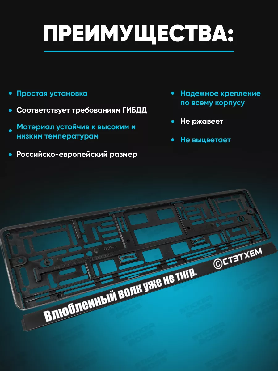 Рамка для ГОС номера автомобиля 52х13х1 см универсальная, выполнена из качественного и надежного ABS пластика. Она подойдет практически для любой марки автомобиля. На лицевой стороне выполнена качественная печать методом УФ печати, которая устойчива к любым погодным условиям, не выгорает со временем и не выцветает. Принты и надписи выполнены в лучших традициях Бренда Stickerboss, что способствует привлечению все большего количества восторженных взглядов к вашему авто. Наши рамки для машины будут выполнять не только свою основную функцию по креплению номерного знака, но и добавит стиля вашей машине. Ее легко установить: крепление надежное, плотно прилегает к бамперу и прослужит Вам длительное время. Такой автотовар - отличная идея для подарка другу! Автомобильному аксессуару не страшны дождь, снег и перепады температур. Конструкция изделия соответствует требованиям ГИБДД, имеет Российско-европейский размер. Вы можете выбрать любую из рамок с надписью на свой вкус, перейдя в каталог магазина Stickerboss! Также от нашего бренда можно приобрести разные товары для авто.