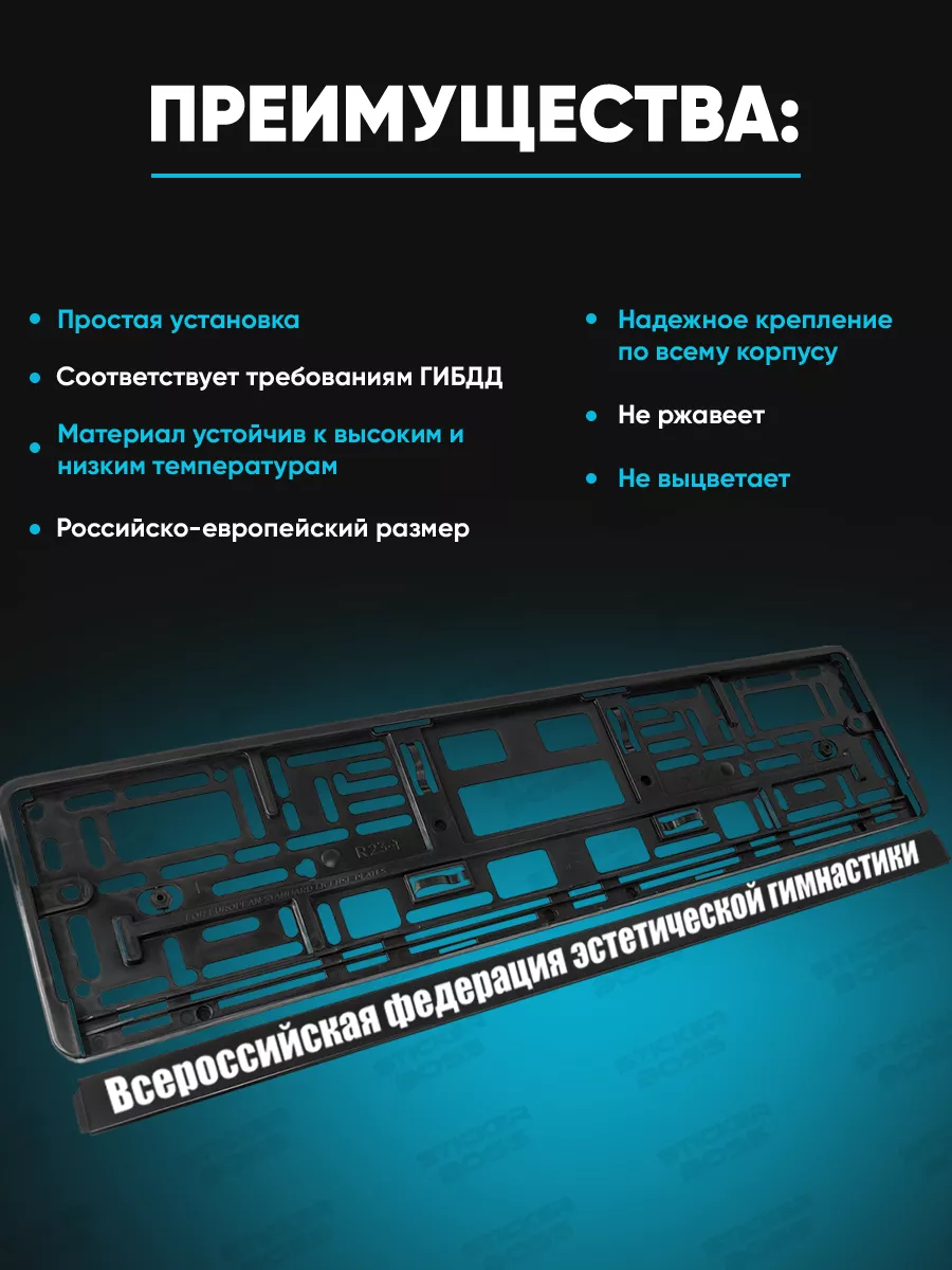 Рамка для ГОС номера автомобиля 52х13х1 см универсальная, выполнена из качественного и надежного ABS пластика. Она подойдет практически для любой марки автомобиля. На лицевой стороне выполнена качественная печать методом УФ печати, которая устойчива к любым погодным условиям, не выгорает со временем и не выцветает. Принты и надписи выполнены в лучших традициях Бренда Stickerboss, что способствует привлечению все большего количества восторженных взглядов к вашему авто. Наши рамки для машины будут выполнять не только свою основную функцию по креплению номерного знака, но и добавит стиля вашей машине. Ее легко установить: крепление надежное, плотно прилегает к бамперу и прослужит Вам длительное время. Такой автотовар - отличная идея для подарка другу! Автомобильному аксессуару не страшны дождь, снег и перепады температур. Конструкция изделия соответствует требованиям ГИБДД, имеет Российско-европейский размер. Вы можете выбрать любую из рамок с надписью на свой вкус, перейдя в каталог магазина Stickerboss! Также от нашего бренда можно приобрести разные товары для авто.