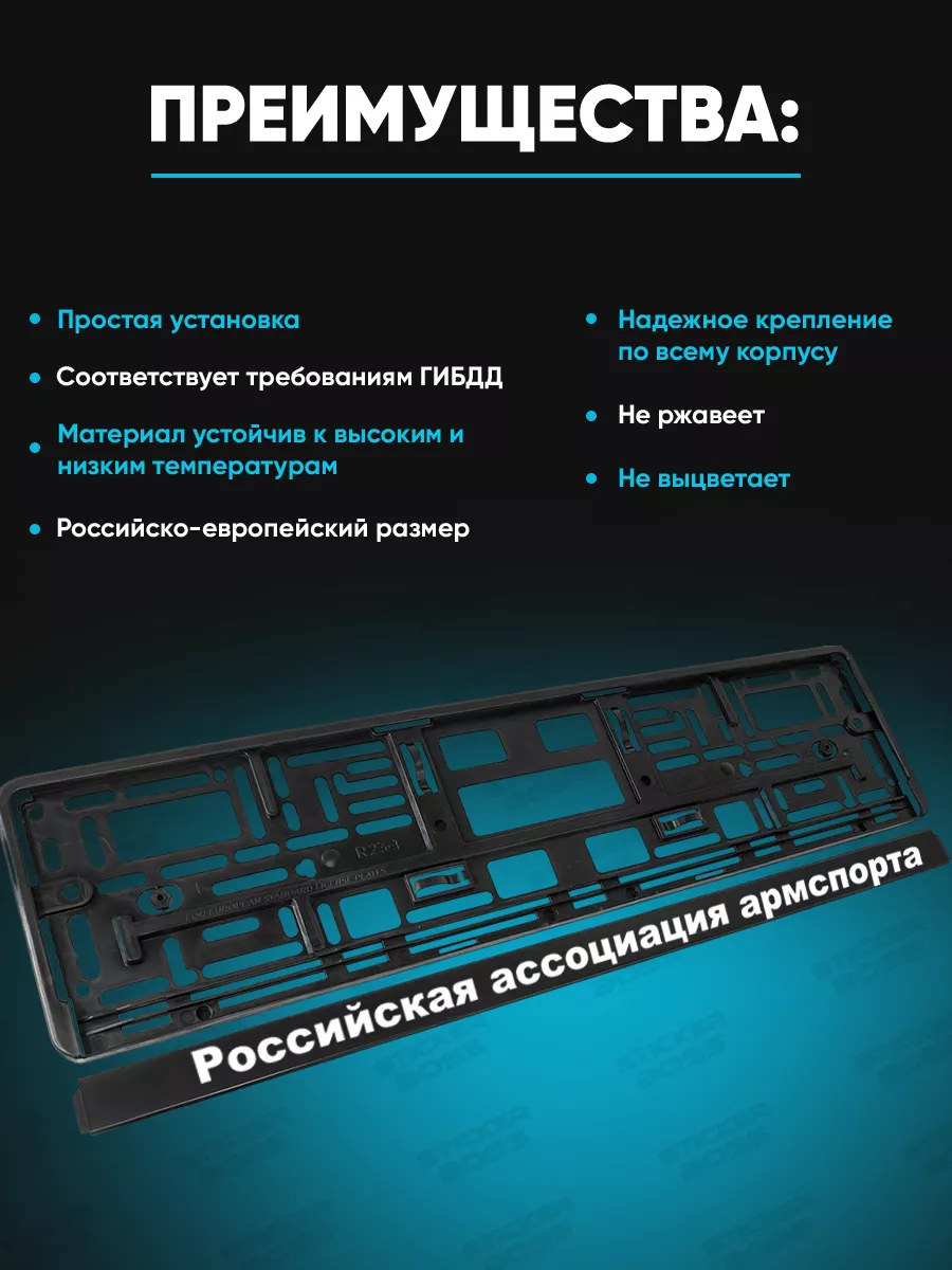 Рамка для ГОС номера автомобиля 52х13х1 см универсальная, выполнена из качественного и надежного ABS пластика. Она подойдет практически для любой марки автомобиля. На лицевой стороне выполнена качественная печать методом УФ печати, которая устойчива к любым погодным условиям, не выгорает со временем и не выцветает. Принты и надписи выполнены в лучших традициях Бренда Stickerboss, что способствует привлечению все большего количества восторженных взглядов к вашему авто. Наши рамки для машины будут выполнять не только свою основную функцию по креплению номерного знака, но и добавит стиля вашей машине. Ее легко установить: крепление надежное, плотно прилегает к бамперу и прослужит Вам длительное время. Такой автотовар - отличная идея для подарка другу! Автомобильному аксессуару не страшны дождь, снег и перепады температур. Конструкция изделия соответствует требованиям ГИБДД, имеет Российско-европейский размер. Вы можете выбрать любую из рамок с надписью на свой вкус, перейдя в каталог магазина Stickerboss! Также от нашего бренда можно приобрести разные товары для авто.