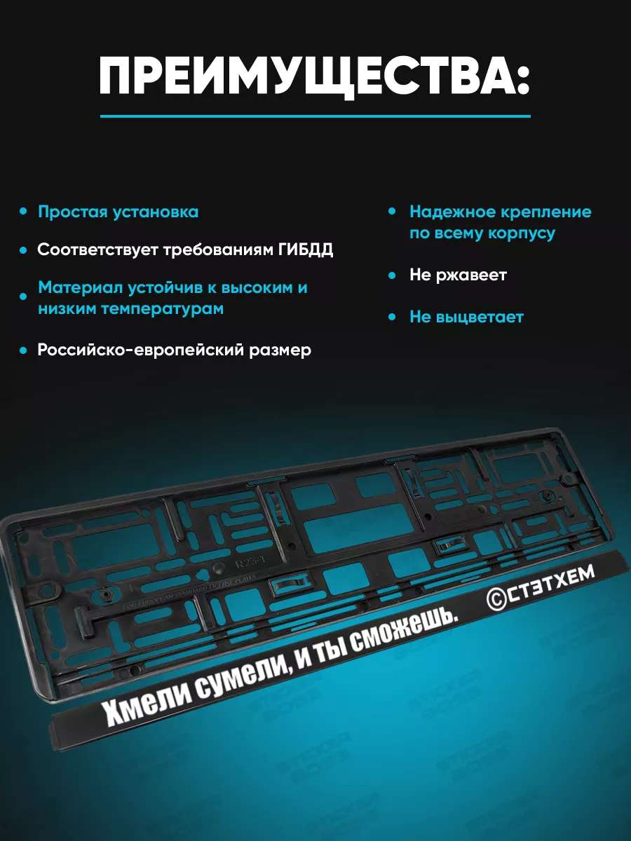 Рамка для ГОС номера автомобиля 52х13х1 см универсальная, выполнена из качественного и надежного ABS пластика. Она подойдет практически для любой марки автомобиля. На лицевой стороне выполнена качественная печать методом УФ печати, которая устойчива к любым погодным условиям, не выгорает со временем и не выцветает. Принты и надписи выполнены в лучших традициях Бренда Stickerboss, что способствует привлечению все большего количества восторженных взглядов к вашему авто. Наши рамки для машины будут выполнять не только свою основную функцию по креплению номерного знака, но и добавит стиля вашей машине. Ее легко установить: крепление надежное, плотно прилегает к бамперу и прослужит Вам длительное время. Такой автотовар - отличная идея для подарка другу! Автомобильному аксессуару не страшны дождь, снег и перепады температур. Конструкция изделия соответствует требованиям ГИБДД, имеет Российско-европейский размер. Вы можете выбрать любую из рамок с надписью на свой вкус, перейдя в каталог магазина Stickerboss! Также от нашего бренда можно приобрести разные товары для авто.