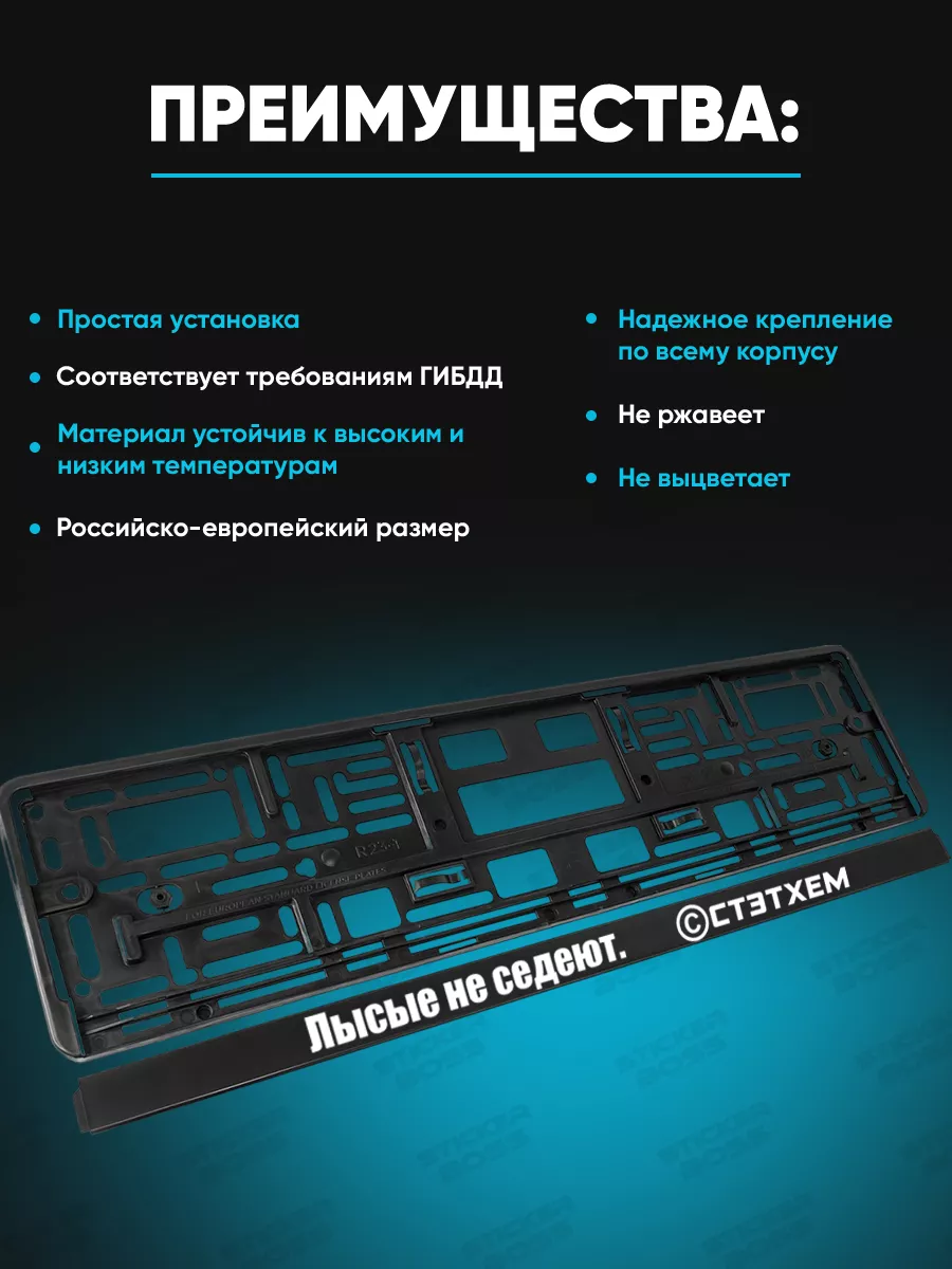 Рамка для ГОС номера автомобиля 52х13х1 см универсальная, выполнена из качественного и надежного ABS пластика. Она подойдет практически для любой марки автомобиля. На лицевой стороне выполнена качественная печать методом УФ печати, которая устойчива к любым погодным условиям, не выгорает со временем и не выцветает. Принты и надписи выполнены в лучших традициях Бренда Stickerboss, что способствует привлечению все большего количества восторженных взглядов к вашему авто. Наши рамки для машины будут выполнять не только свою основную функцию по креплению номерного знака, но и добавит стиля вашей машине. Ее легко установить: крепление надежное, плотно прилегает к бамперу и прослужит Вам длительное время. Такой автотовар - отличная идея для подарка другу! Автомобильному аксессуару не страшны дождь, снег и перепады температур. Конструкция изделия соответствует требованиям ГИБДД, имеет Российско-европейский размер. Вы можете выбрать любую из рамок с надписью на свой вкус, перейдя в каталог магазина Stickerboss! Также от нашего бренда можно приобрести разные товары для авто.
