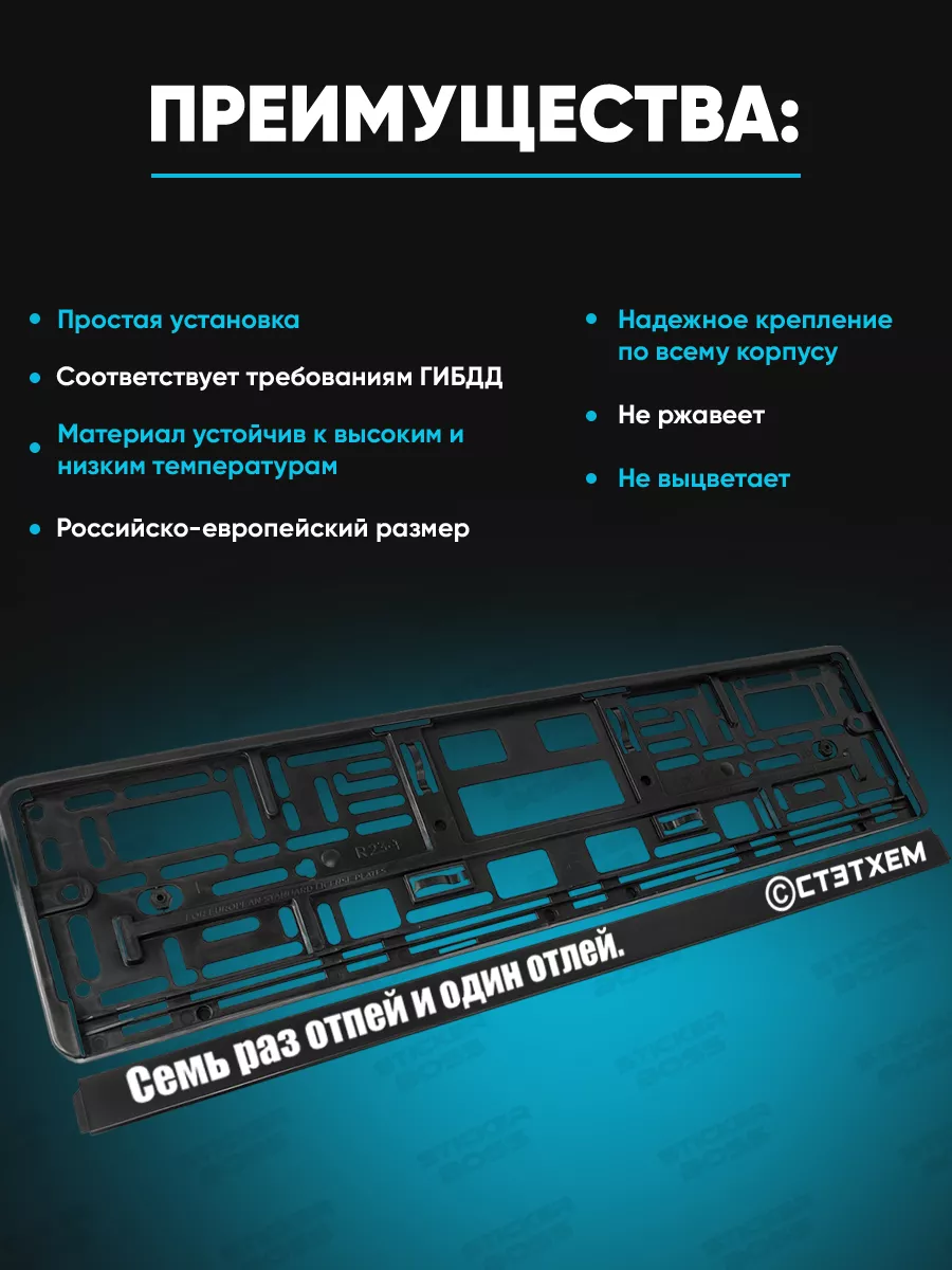 Рамка для ГОС номера автомобиля 52х13х1 см универсальная, выполнена из качественного и надежного ABS пластика. Она подойдет практически для любой марки автомобиля. На лицевой стороне выполнена качественная печать методом УФ печати, которая устойчива к любым погодным условиям, не выгорает со временем и не выцветает. Принты и надписи выполнены в лучших традициях Бренда Stickerboss, что способствует привлечению все большего количества восторженных взглядов к вашему авто. Наши рамки для машины будут выполнять не только свою основную функцию по креплению номерного знака, но и добавит стиля вашей машине. Ее легко установить: крепление надежное, плотно прилегает к бамперу и прослужит Вам длительное время. Такой автотовар - отличная идея для подарка другу! Автомобильному аксессуару не страшны дождь, снег и перепады температур. Конструкция изделия соответствует требованиям ГИБДД, имеет Российско-европейский размер. Вы можете выбрать любую из рамок с надписью на свой вкус, перейдя в каталог магазина Stickerboss! Также от нашего бренда можно приобрести разные товары для авто.