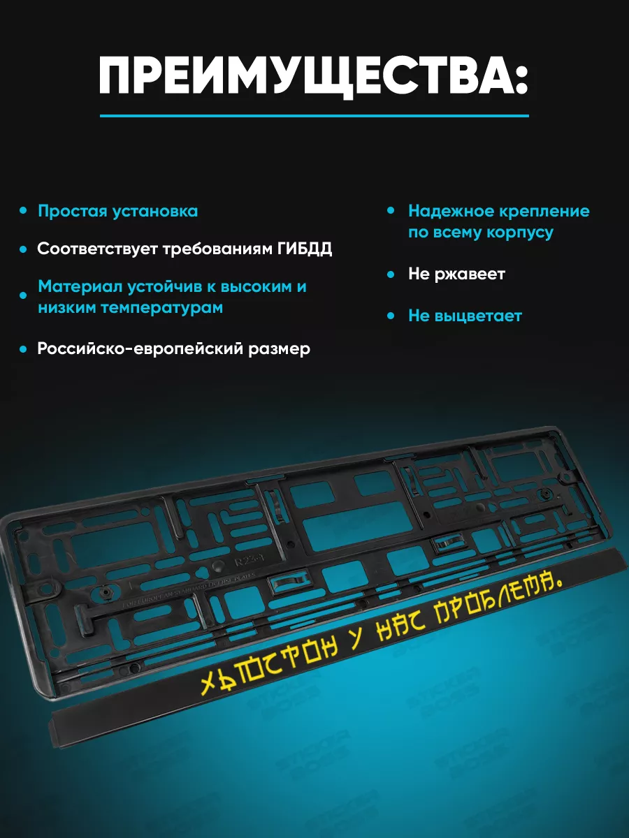 Рамка для ГОС номера автомобиля 52х13х1 см универсальная, выполнена из качественного и надежного ABS пластика. Она подойдет практически для любой марки автомобиля. На лицевой стороне выполнена качественная печать методом УФ печати, которая устойчива к любым погодным условиям, не выгорает со временем и не выцветает. Принты и надписи выполнены в лучших традициях Бренда Stickerboss, что способствует привлечению все большего количества восторженных взглядов к вашему авто. Наши рамки для машины будут выполнять не только свою основную функцию по креплению номерного знака, но и добавит стиля вашей машине. Ее легко установить: крепление надежное, плотно прилегает к бамперу и прослужит Вам длительное время. Такой автотовар - отличная идея для подарка другу! Автомобильному аксессуару не страшны дождь, снег и перепады температур. Конструкция изделия соответствует требованиям ГИБДД, имеет Российско-европейский размер. Вы можете выбрать любую из рамок с надписью на свой вкус, перейдя в каталог магазина Stickerboss! Также от нашего бренда можно приобрести разные товары для авто.