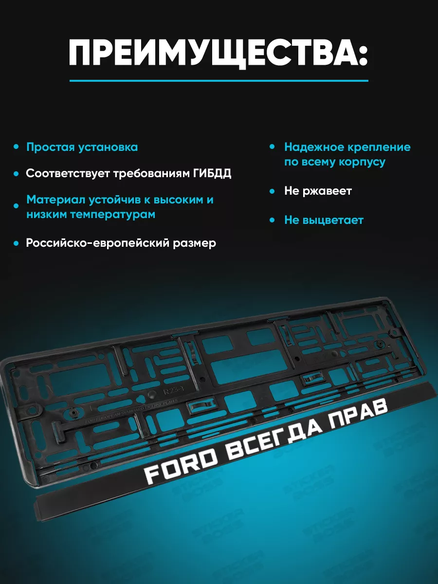 Рамка для ГОС номера автомобиля 52х13х1 см универсальная, выполнена из качественного и надежного ABS пластика. Она подойдет практически для любой марки автомобиля. На лицевой стороне выполнена качественная печать методом УФ печати, которая устойчива к любым погодным условиям, не выгорает со временем и не выцветает. Принты и надписи выполнены в лучших традициях Бренда Stickerboss, что способствует привлечению все большего количества восторженных взглядов к вашему авто. Наши рамки для машины будут выполнять не только свою основную функцию по креплению номерного знака, но и добавит стиля вашей машине. Ее легко установить: крепление надежное, плотно прилегает к бамперу и прослужит Вам длительное время. Такой автотовар - отличная идея для подарка другу! Автомобильному аксессуару не страшны дождь, снег и перепады температур. Конструкция изделия соответствует требованиям ГИБДД, имеет Российско-европейский размер. Вы можете выбрать любую из рамок с надписью на свой вкус, перейдя в каталог магазина Stickerboss! Также от нашего бренда можно приобрести разные товары для авто.