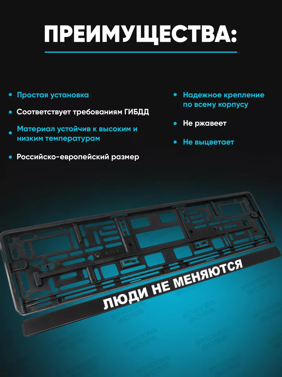 Рамка для ГОС номера автомобиля 52х13х1 см универсальная, выполнена из качественного и надежного ABS пластика. Она подойдет практически для любой марки автомобиля. На лицевой стороне выполнена качественная печать методом УФ печати, которая устойчива к любым погодным условиям, не выгорает со временем и не выцветает. Принты и надписи выполнены в лучших традициях Бренда Stickerboss, что способствует привлечению все большего количества восторженных взглядов к вашему авто. Наши рамки для машины будут выполнять не только свою основную функцию по креплению номерного знака, но и добавит стиля вашей машине. Ее легко установить: крепление надежное, плотно прилегает к бамперу и прослужит Вам длительное время. Такой автотовар - отличная идея для подарка другу! Автомобильному аксессуару не страшны дождь, снег и перепады температур. Конструкция изделия соответствует требованиям ГИБДД, имеет Российско-европейский размер. Вы можете выбрать любую из рамок с надписью на свой вкус, перейдя в каталог магазина Stickerboss! Также от нашего бренда можно приобрести разные товары для авто.