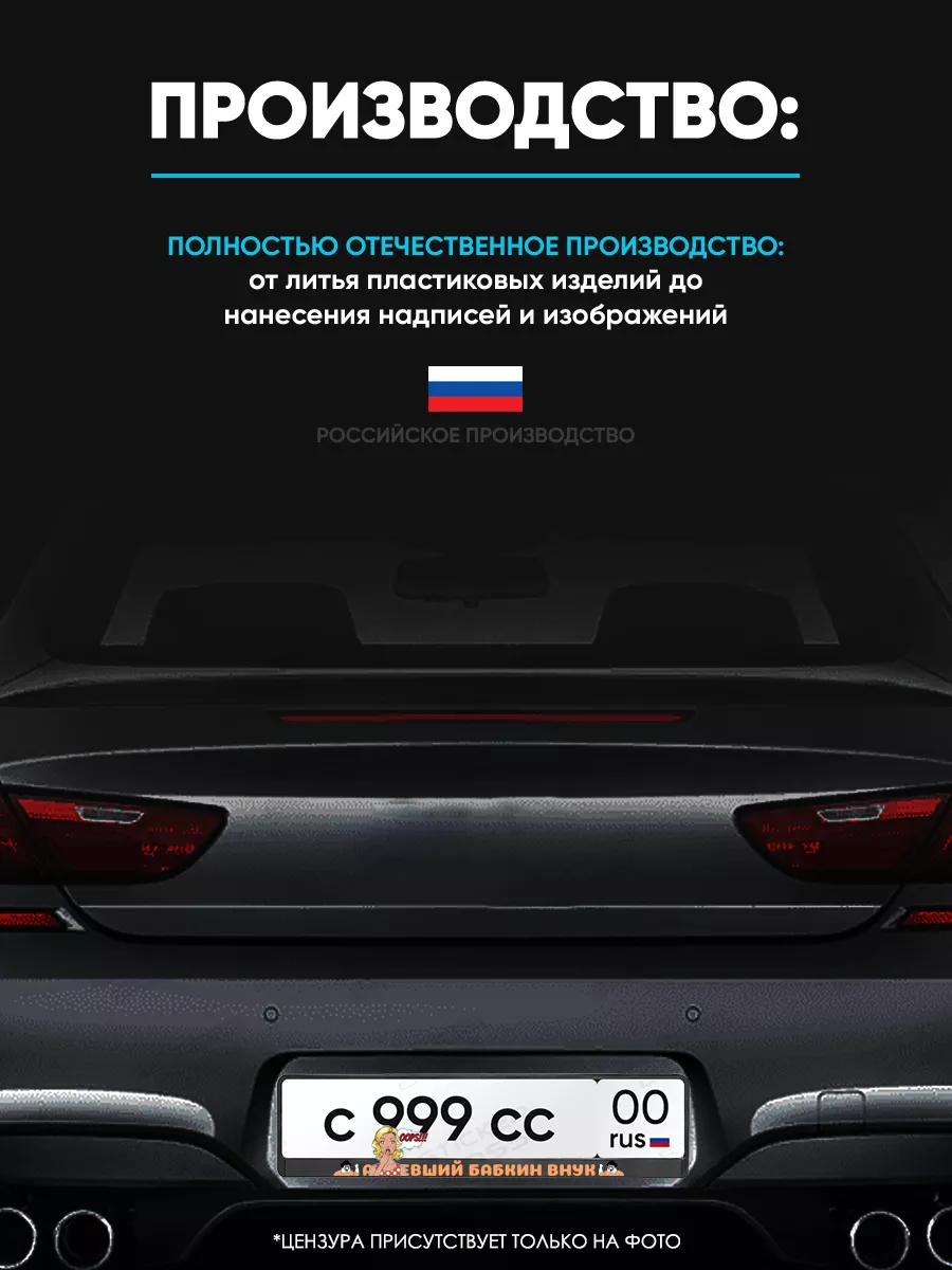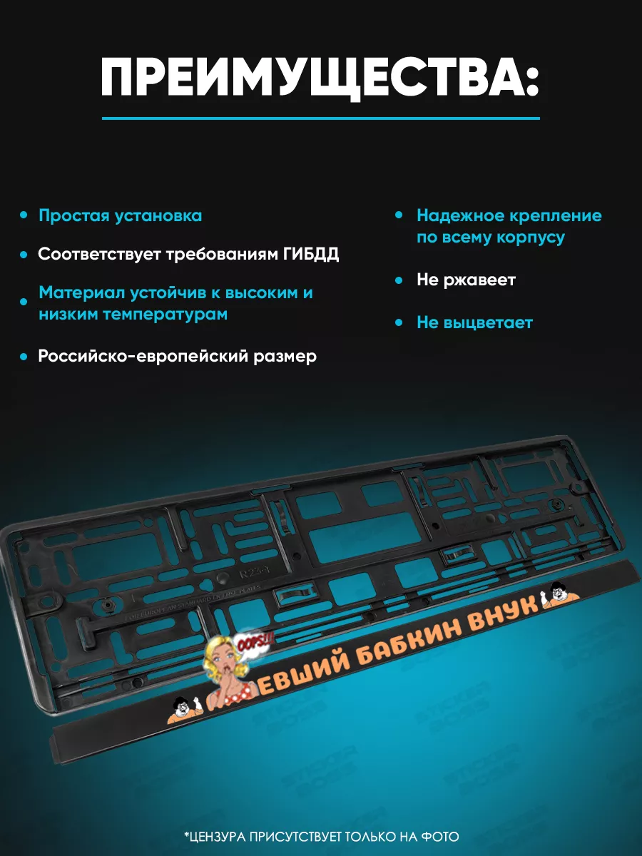 Рамка для ГОС номера автомобиля 52х13х1 см универсальная, выполнена из качественного и надежного ABS пластика. Она подойдет практически для любой марки автомобиля. На лицевой стороне выполнена качественная печать методом УФ печати, которая устойчива к любым погодным условиям, не выгорает со временем и не выцветает. Принты и надписи выполнены в лучших традициях Бренда Stickerboss, что способствует привлечению все большего количества восторженных взглядов к вашему авто. Наши рамки для машины будут выполнять не только свою основную функцию по креплению номерного знака, но и добавит стиля вашей машине. Ее легко установить: крепление надежное, плотно прилегает к бамперу и прослужит Вам длительное время. Такой автотовар - отличная идея для подарка другу! Автомобильному аксессуару не страшны дождь, снег и перепады температур. Конструкция изделия соответствует требованиям ГИБДД, имеет Российско-европейский размер. Вы можете выбрать любую из рамок с надписью на свой вкус, перейдя в каталог магазина Stickerboss! Также от нашего бренда можно приобрести разные товары для авто.