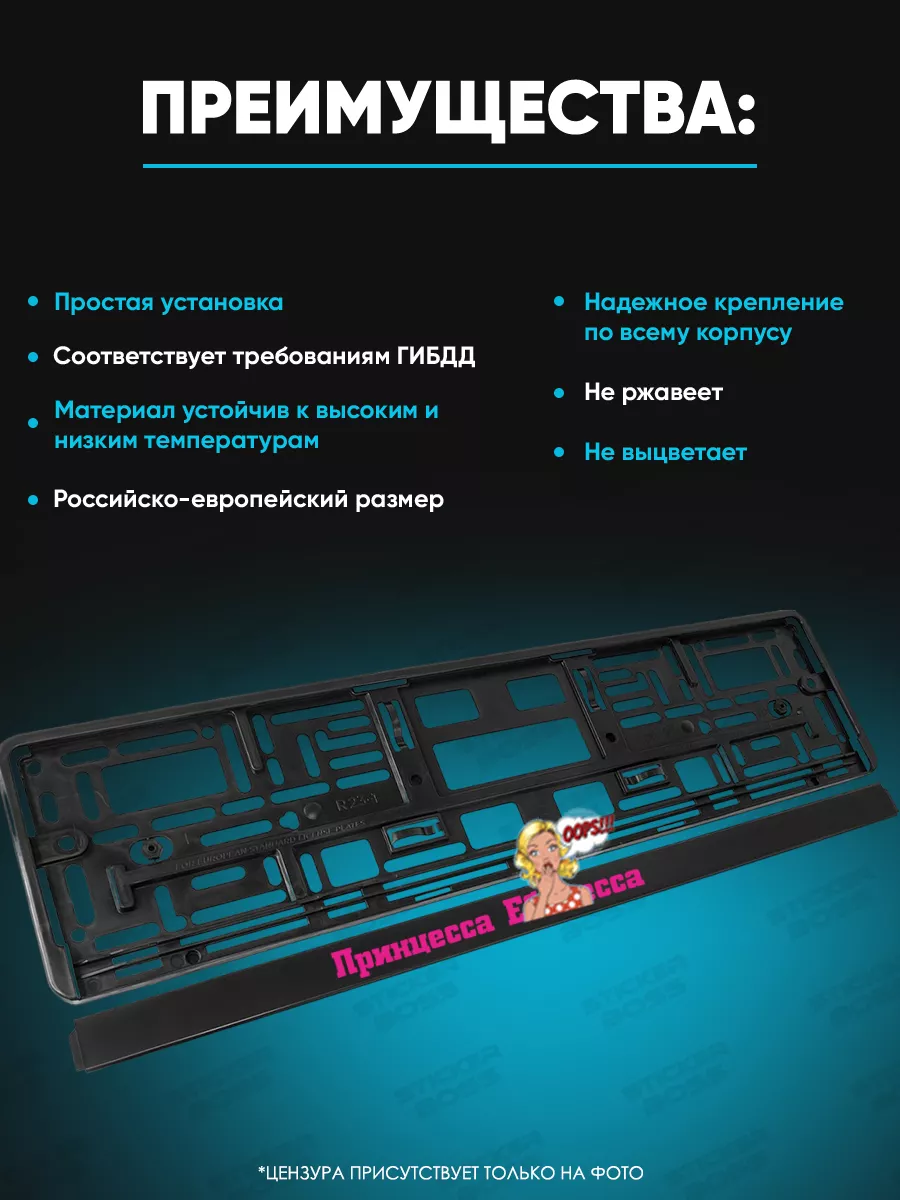Рамка для ГОС номера автомобиля 52х13х1 см универсальная, выполнена из качественного и надежного ABS пластика. Она подойдет практически для любой марки автомобиля. На лицевой стороне выполнена качественная печать методом УФ печати, которая устойчива к любым погодным условиям, не выгорает со временем и не выцветает. Принты и надписи выполнены в лучших традициях Бренда Stickerboss, что способствует привлечению все большего количества восторженных взглядов к вашему авто. Наши рамки для машины будут выполнять не только свою основную функцию по креплению номерного знака, но и добавит стиля вашей машине. Ее легко установить: крепление надежное, плотно прилегает к бамперу и прослужит Вам длительное время. Такой автотовар - отличная идея для подарка другу! Автомобильному аксессуару не страшны дождь, снег и перепады температур. Конструкция изделия соответствует требованиям ГИБДД, имеет Российско-европейский размер. Вы можете выбрать любую из рамок с надписью на свой вкус, перейдя в каталог магазина Stickerboss! Также от нашего бренда можно приобрести разные товары для авто.