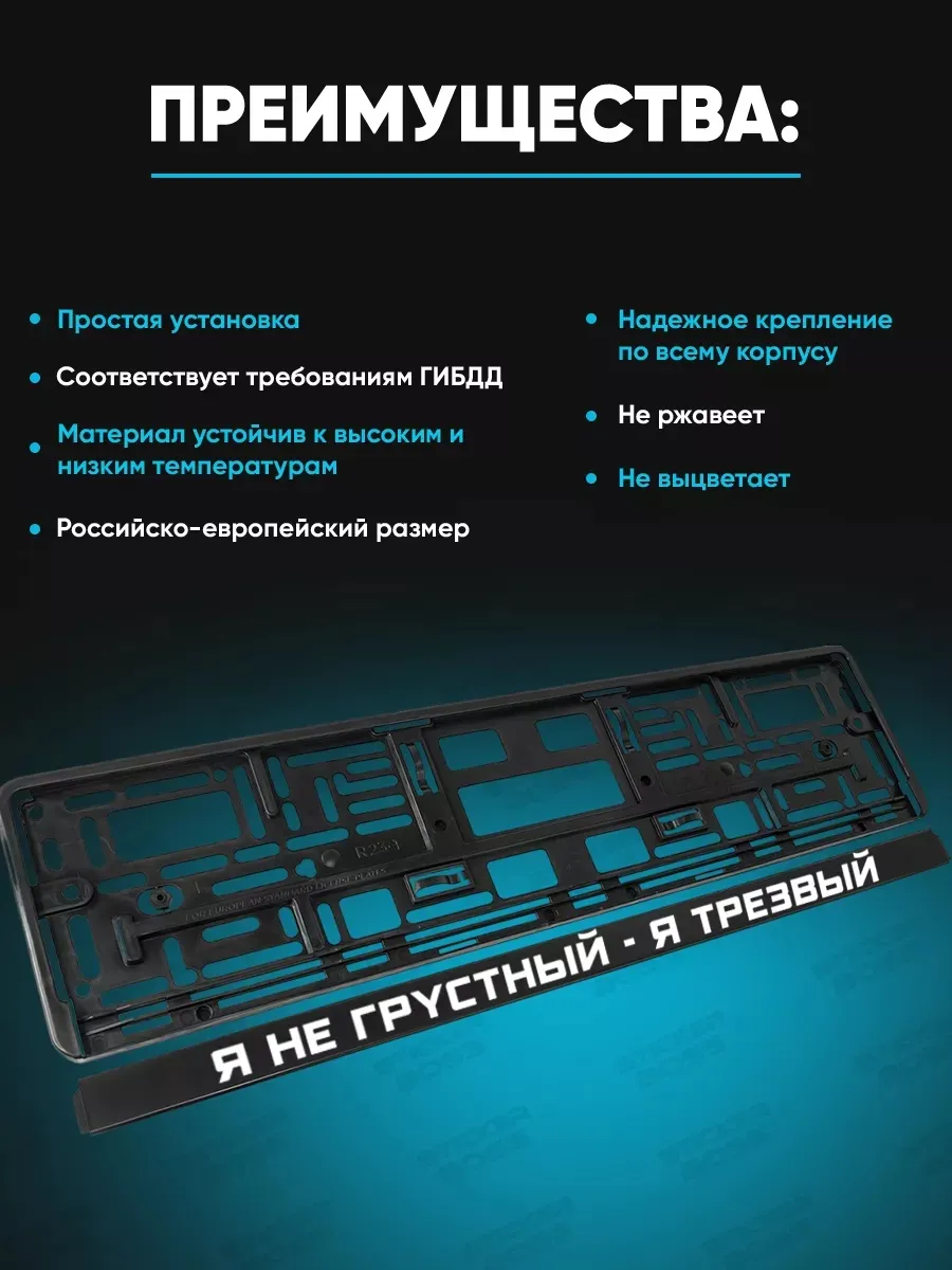 Рамка для ГОС номера автомобиля 52х13х1 см универсальная, выполнена из качественного и надежного ABS пластика. Она подойдет практически для любой марки автомобиля. На лицевой стороне выполнена качественная печать методом УФ печати, которая устойчива к любым погодным условиям, не выгорает со временем и не выцветает. Принты и надписи выполнены в лучших традициях Бренда Stickerboss, что способствует привлечению все большего количества восторженных взглядов к вашему авто. Наши рамки для машины будут выполнять не только свою основную функцию по креплению номерного знака, но и добавит стиля вашей машине. Ее легко установить: крепление надежное, плотно прилегает к бамперу и прослужит Вам длительное время. Такой автотовар - отличная идея для подарка другу! Автомобильному аксессуару не страшны дождь, снег и перепады температур. Конструкция изделия соответствует требованиям ГИБДД, имеет Российско-европейский размер. Вы можете выбрать любую из рамок с надписью на свой вкус, перейдя в каталог магазина Stickerboss! Также от нашего бренда можно приобрести разные товары для авто.