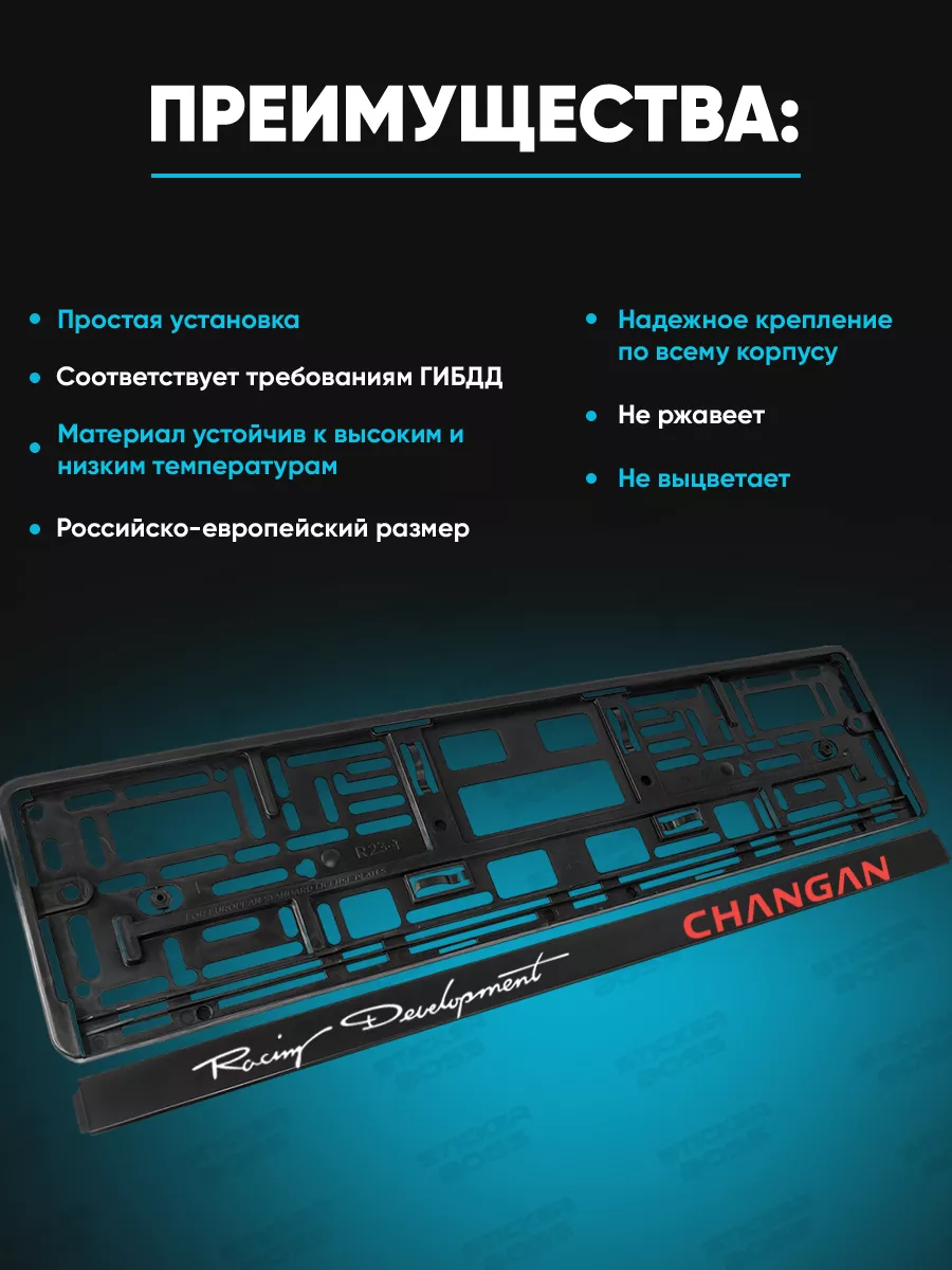 Рамка подходит для размещения государственного номерного знака на автомобилях и не ограничивает стиль автомобиля. Конструкция соответствует требованиям ГИБДД и имеет российско-европейский размер.