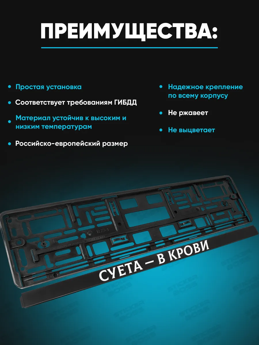 Рамка для гос номера 1 шт выполнена из ABS-пластика и рассчитана на универсальные крепления. На лицевой стороне нанесена UV-печать, стойкая к воздействию ультрафиолета, дождя и перепадов температур. Принты и надписи соответствуют стилю бренда Stickerboss, что подчёркивает индивидуальность автомобиля и привлекает внимание на дороге.