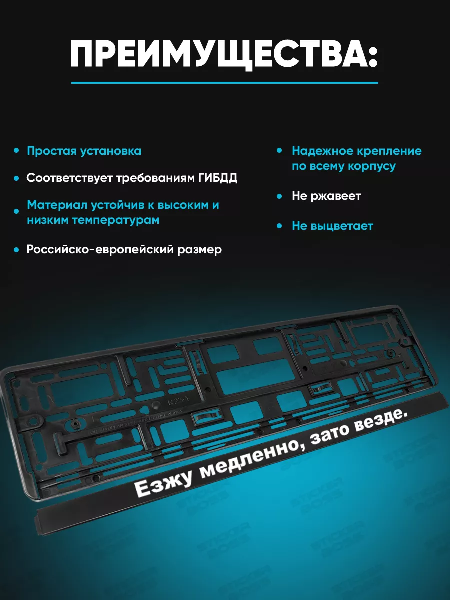 Преимущества данной рамки для гос номера в долговечности и стиле. Рамки выполнены из ABS-пластика и оформлены принтом методом УФ-печати, что обеспечивает устойчивость к солнцу, дождю и перепадам температур. В комплект входит 2 рамки, которые подходят под большинство марок автомобилей, соответствуют российско-европейскому размеру и сохраняют яркость печати на длительный срок.