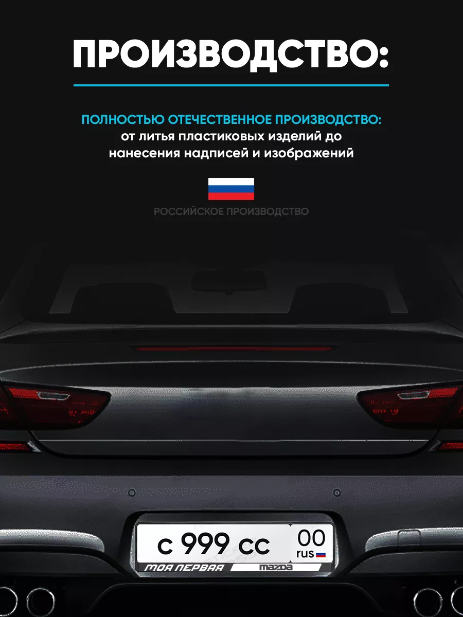 Пара рамок для гос номера обеспечивает надежное крепление и стильный внешний вид автомобиля. Изготовлены из ABS-пластика и покрыты УФ-печатью, благодаря чему принты сохраняют насыщенность цветов под воздействием солнца, дождя и перепадов температур. В комплекте 2 шт., рассчитаны под большинство марок. Надпись mazda нанесена на лицевой стороне согласно артикулу арт.0907. Производство — Россия, бренд Stickerboss.