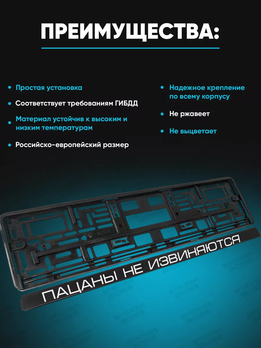 Рамка предназначена для крепления государственного номера на транспортном средстве. Благодаря универсальным размерам и механическому креплению она подходит к большинству автомобилей и не мешает штатной системе крепления номерного знака. Соответствует требованиям ГИБДД и имеет российско-европейский размер.
