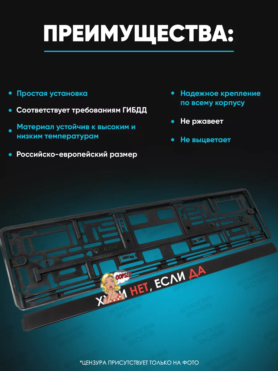 В конструкции учтены требования к гос номеру и совместимость с российско-европейским размером. Рамки выполнены в стильном исполнении и выполнены брендом Stickerboss. Печать осуществляется методом УФ-печати, что обеспечивает яркость и долговечность изображения.