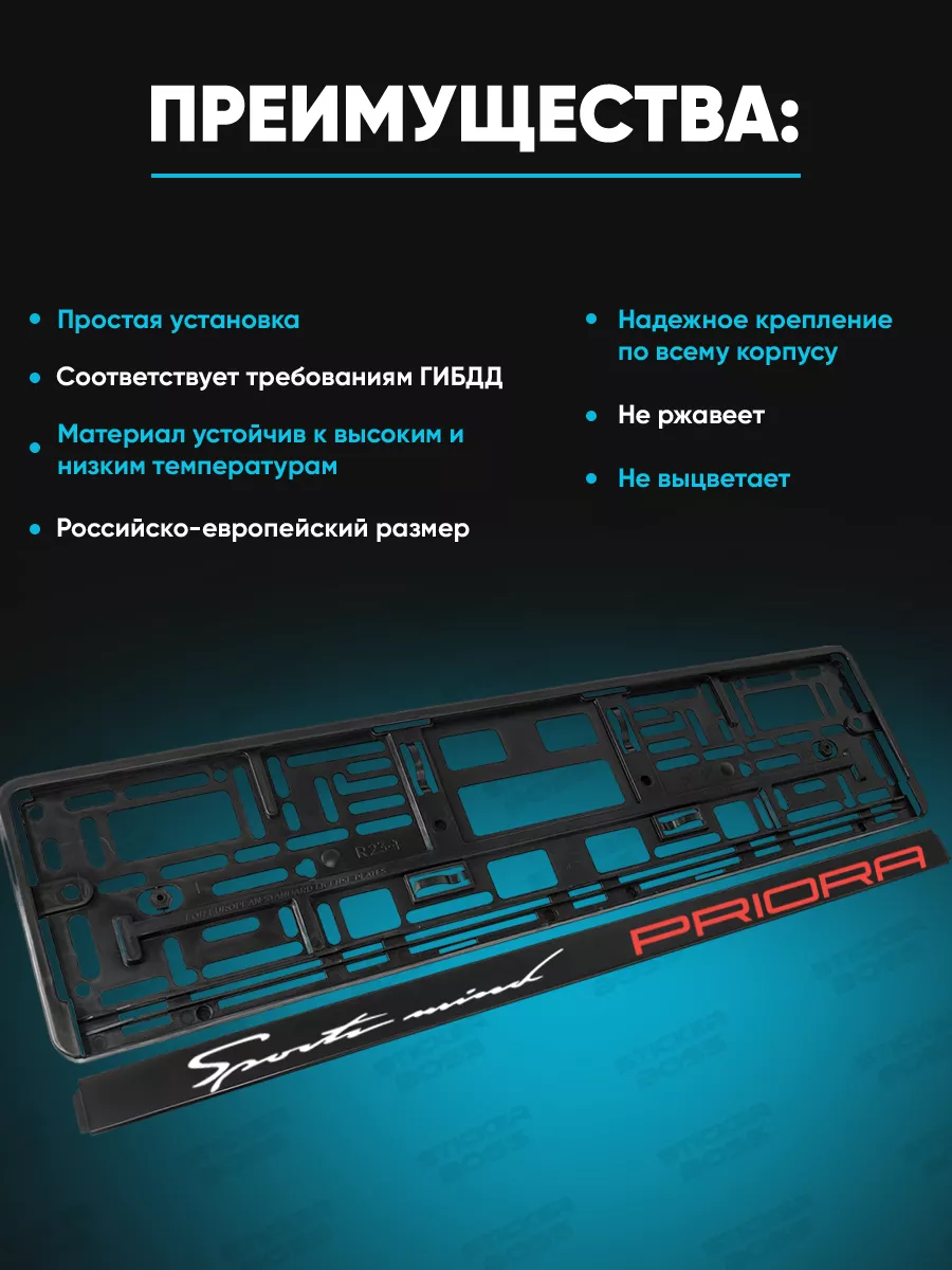Рамка для гос номера обеспечивает крепление номерного знака и добавляет стиль автомобилю. Изготовлена из ABS-пластика, рассчитана на Российско-европейский размер и соответствует требованиям ГИБДД. В комплект входит 2 рамки; лицевой стороной нанесена качественная УФ-печать, устойчивая к солнечному свету, перепадам температур и осадкам. Данные принты и надписи выполнены по дизайну Stickerboss и помогают авто привлекать внимание.