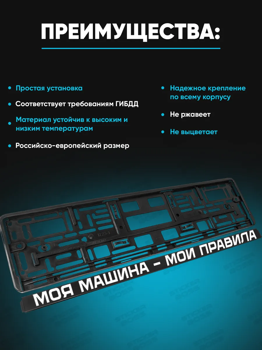 Stickerboss представляет рамки для гос номера в виде комплекта из двух элементов, изготовленных из ABS-пластика. Размер 52x13 см, что соответствует российско-европейскому размеру номера. Печать выполнена методом УФ-печати, устойчива к погодным условиям, не выцветает со временем. Комплект рассчитан на длительную службу и не требует сложного обслуживания.