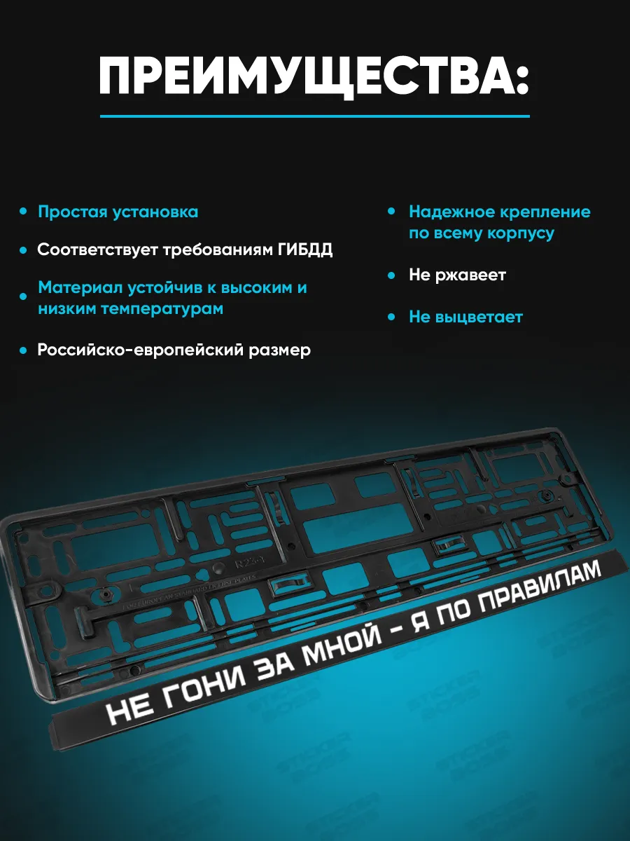 Универсальная конструкция из ABS-пластика; печать УФ-защиты; комплект из 2 рамок; соответствует Российско-европейским размерам; подходит для большинства автомобилей.