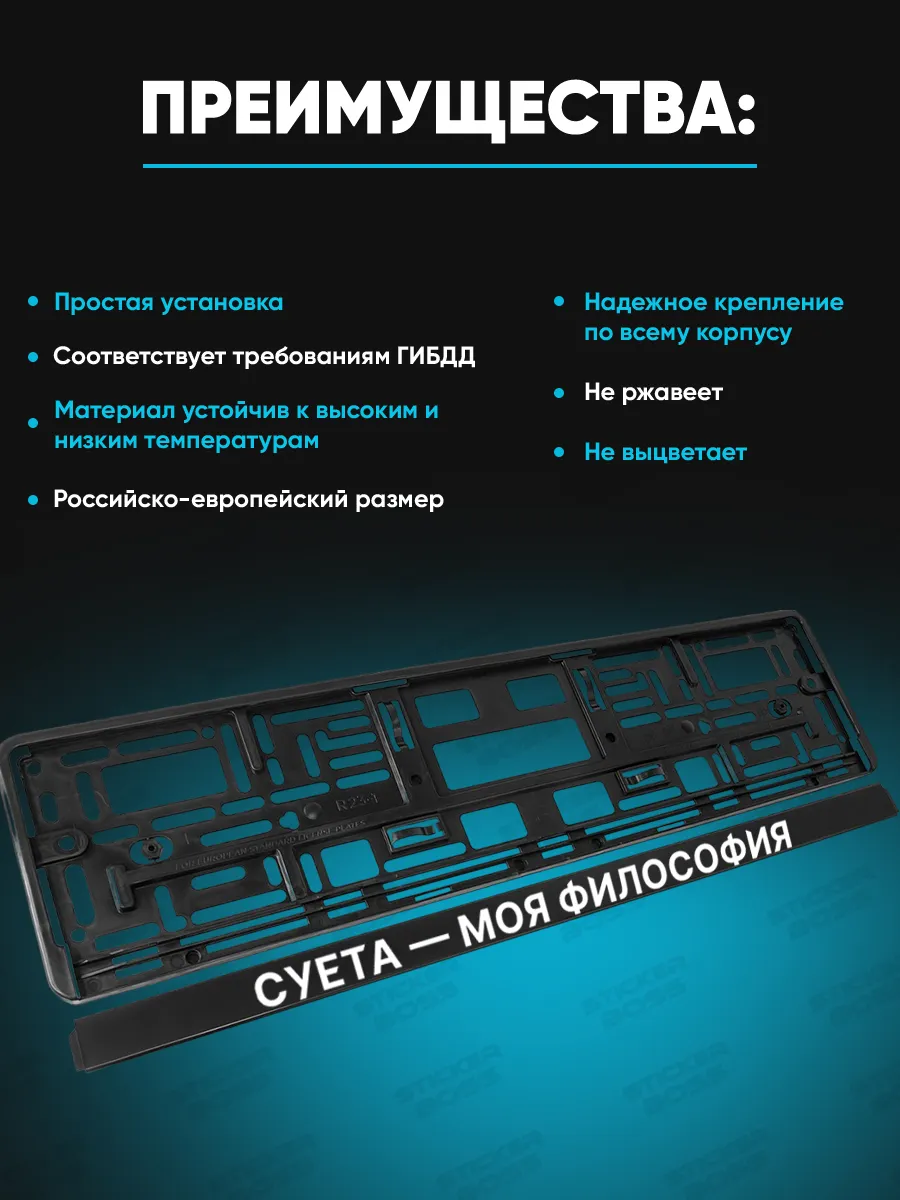 Универсальная рамка для гос номера из ABS-пластика размером 52×13×1 см. Принты выполняются методом УФ-печати, устойчива к погодным условиям, не выцветает и не выгорает со временем. Накладки и надписи можно выбрать на свой вкус в каталоге Stickerboss. Рамка дополнит стиль вашего авто и сохранит основную функцию крепления номерного знака. Конструкция рассчитана на длительную службу и выдерживает дождь, снег и перепады температур. Автомобильный аксессуар, который соответствует требованиям ГИБДД и имеет российско-европейский размер.