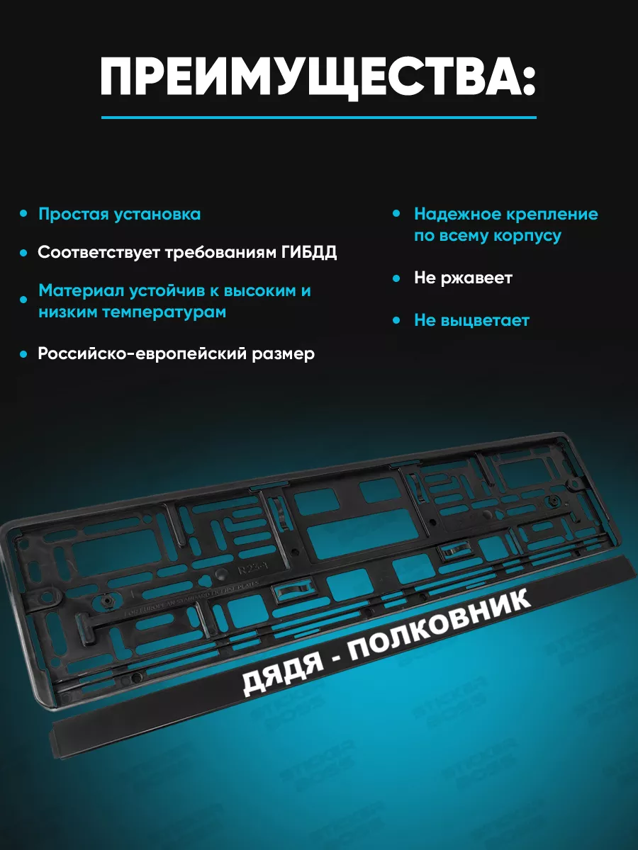 Универсальная рамка для гос номера автомобиля 52х13х1 см выполнена из ABS-пластика и оснащена лицевой стороной с печатью методом УФ-печати. Надпись Дядя добавляет индивидуальности автомобилю и не мешает прочности крепления. Изделие рассчитано на эксплуатацию в условиях российского климата: дождь, снег и перепады температур не повлияют на внешний вид за счет устойчевой УФ-печати и прочного материала. Размеры и конструкция соответствуют российско-европейским стандартам.