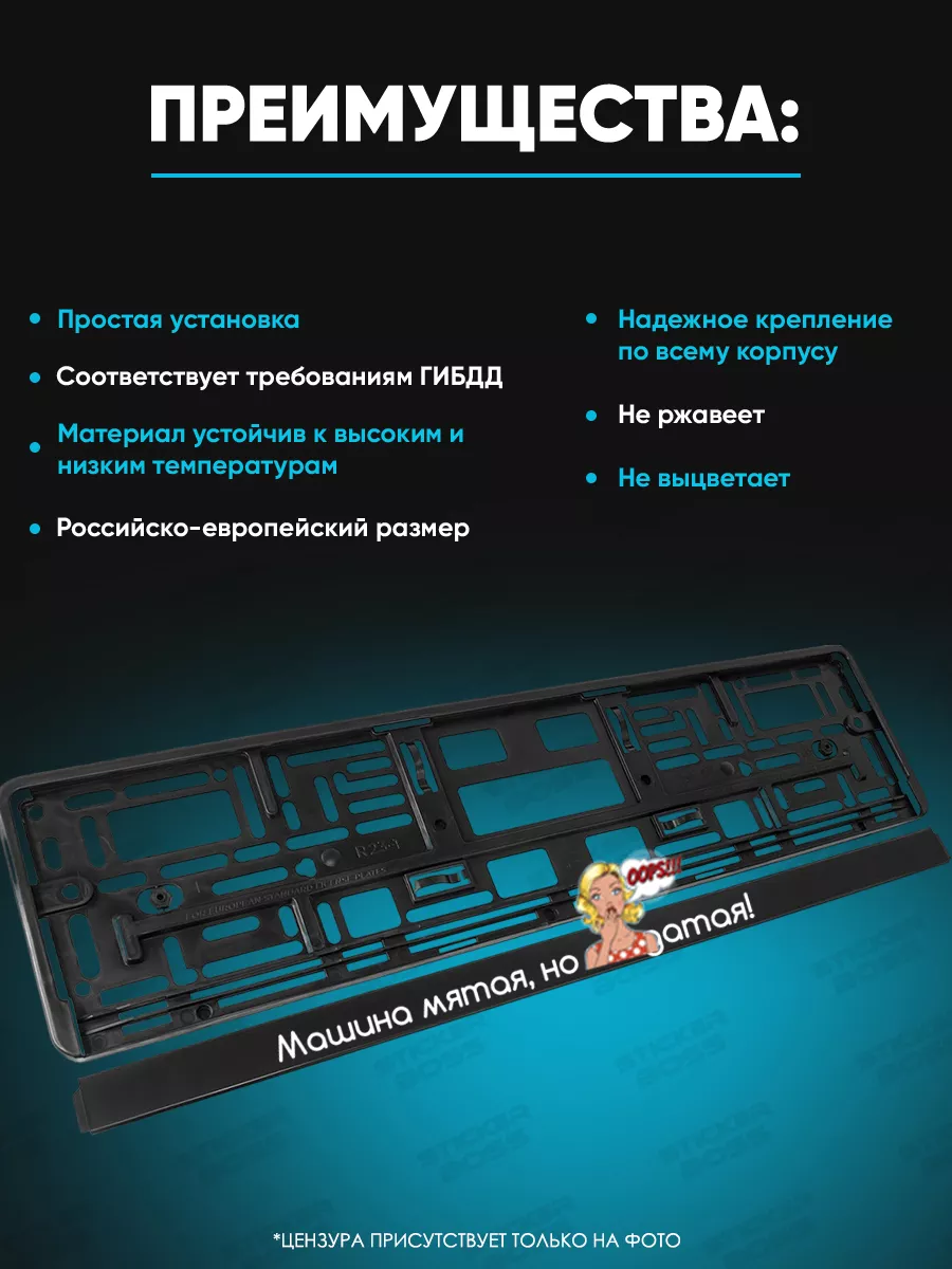 Эта рамка для гос номера сочетает практичность и стиль: она обеспечивает крепление номера и добавляет характер вашему автомобилю. Изготовлена из ABS-пластика, устойчива к погодным условиям, ультрафиолетовым лучам и механическим воздействиям. На лицевой стороне нанесена ультрафиолетовая печать, сохраняющая яркость рисунка и цвет со временем. Продукция бренда Stickerboss демонстрирует качество и современный дизайн, что привлекает внимание к вашему авто. Рамка легко устанавливается и снимается, а крепление надежно держит номер в условиях дождя, снега и перепадов температуры. Рассматривайте её как приятный практичный подарок автомобильному другу. Конструкция соответствует требованиям ГИБДД и имеет российско-европейский размер, что обеспечивает совместимость с большинством марок автомобилей. Цвет изделия — черный. В каталоге Stickerboss можно подобрать рамку с другой надписью на ваш вкус, а также другие автоаксессуары бренда.