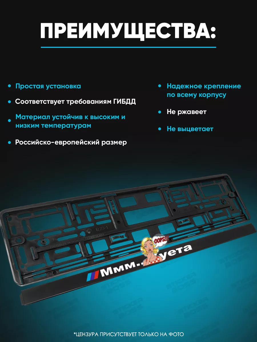 Эта рамка обеспечивает крепление гос номера на автомобиле и в то же время придает стильный внешний вид. Изделие выполнено из ABS-пластика, прочного материала, устойчивого к внешним воздействиям. На лицевой стороне нанесена высококачественная печать методом УФ-печати, которая устойчива к погодным условиям и не выцветает со временем.