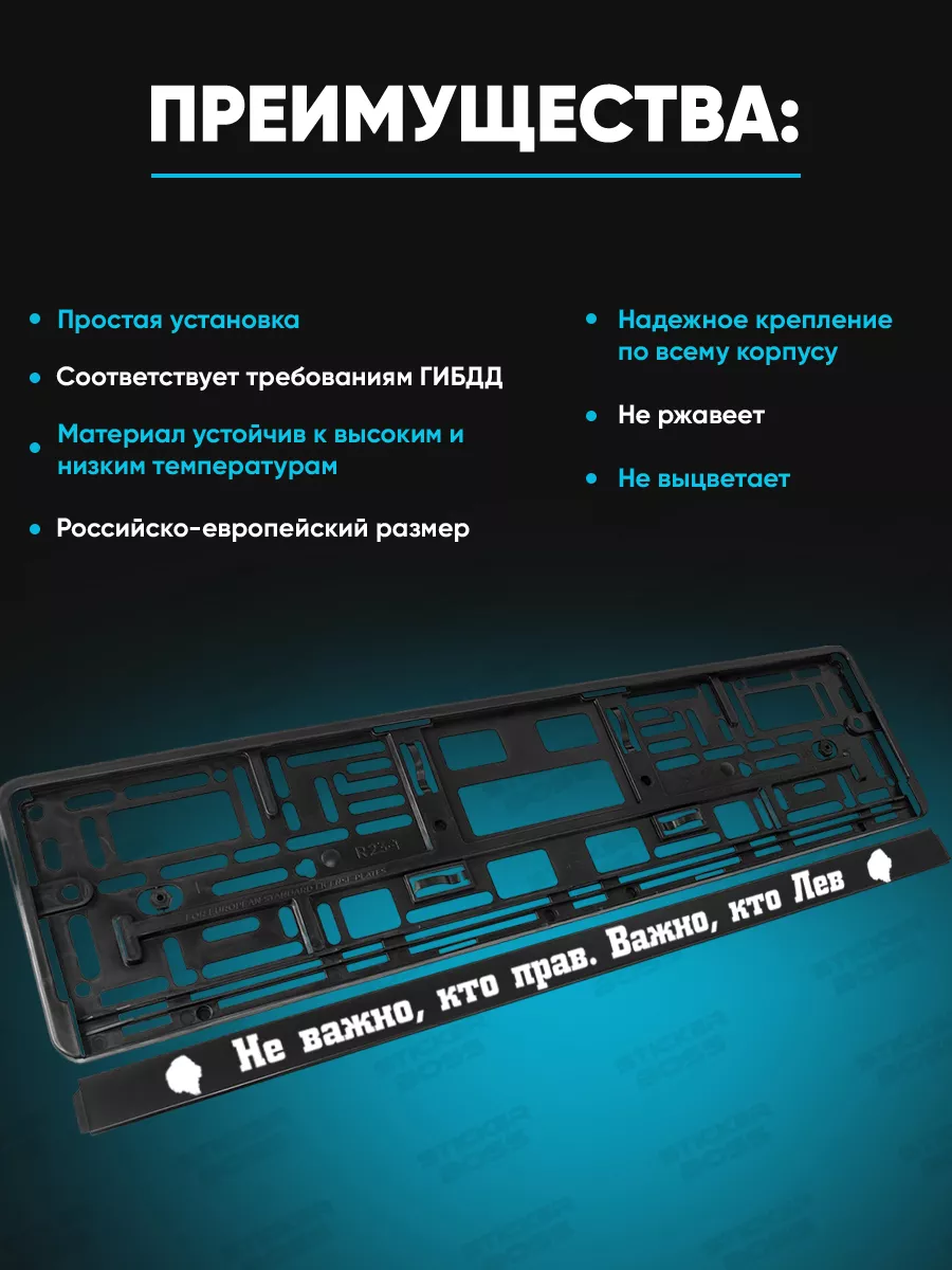 Универсальная рамка для гос номера из ABS-пластика рассчитана на номер 52х13 см и подходит для большинства марок автомобилей. На лицевой стороне применяется УФ-печать, которая не выгорает и не выцветает под воздействием солнца. Рамка дополняет внешний вид автомобиля, оставаясь функциональной. Установка проста: механизм крепления обеспечивает надежное прилегание к бамперу. Рамка соответствует требованиям ГИБДД и имеет российско-европейский размер. В каталоге Stickerboss можно выбрать рамку с нужной надписью; арт. Рамка_0085_черная_1шт. Производство — Россия, бренд Stickerboss.