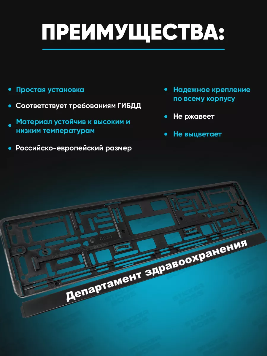 Рамка для гос номера 52х13х1 см универсальная изготовлена из ABS-пластика. На лицевой стороне применена печать методом УФ-печати, что обеспечивает стойкость к солнечному свету и атмосферным воздействиям, сохранность яркости надписей и длительный ресурс эксплуатации. Рамка подходит практически для любой марки автомобиля и соответствует требованиям ГИБДД. Производство России, бренд Stickerboss. Цвет — черный. Артикул производителя Рамка_0073_черная_1шт. Это надежный автомобильный аксессуар, который может стать стильным дополнением к внешнему виду вашего авто и отличным подарком другу. Доставка по РФ.