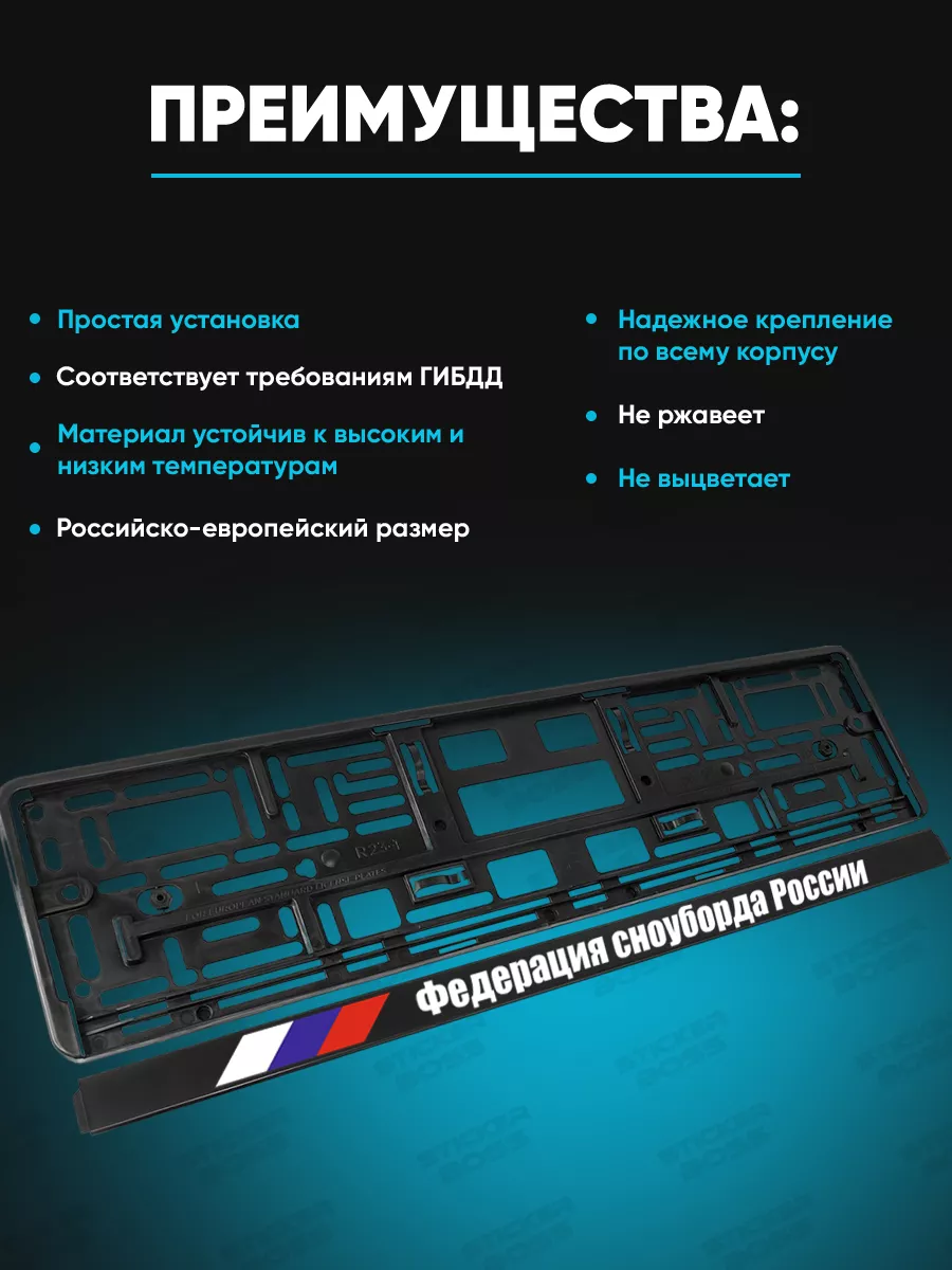 Предназначена для крепления номерного знака, не ограничена одной маркой и подходит для большинства автомобилей. Дополнительно может служить стильным аксессуаром для авто с принтом бренда Stickerboss.