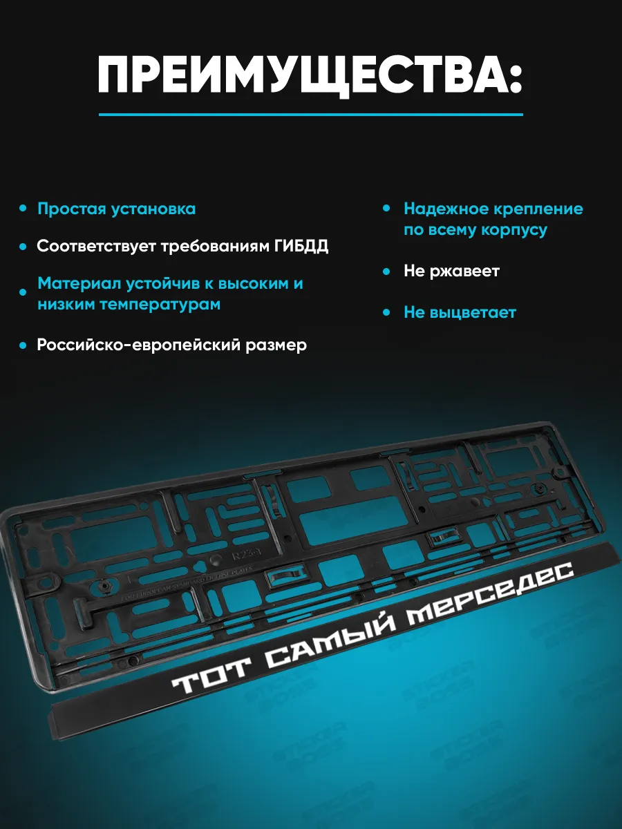 Подходит практически для любой марки автомобиля. Рамка служит для крепления номерного знака, обеспечивает защиту креплений и при этом сохраняет внешний вид автомобиля. Возможность выбора варианта с надписью через каталог Stickerboss позволяет подчеркнуть индивидуальность машины.