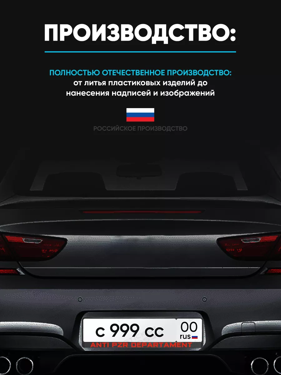Эта пара рамок предназначена для крепления номерного знака автомобиля и дополнительного элемента стиля кузова. Изготовлена из ABS-пластика, в комплекте 2 штуки. Печать на лицевой стороне выполнена методом УФ-печати и устойчива к воздействиям окружающей среды. Размер соответствует российско-европейскому формату; подходят для большинства марок.